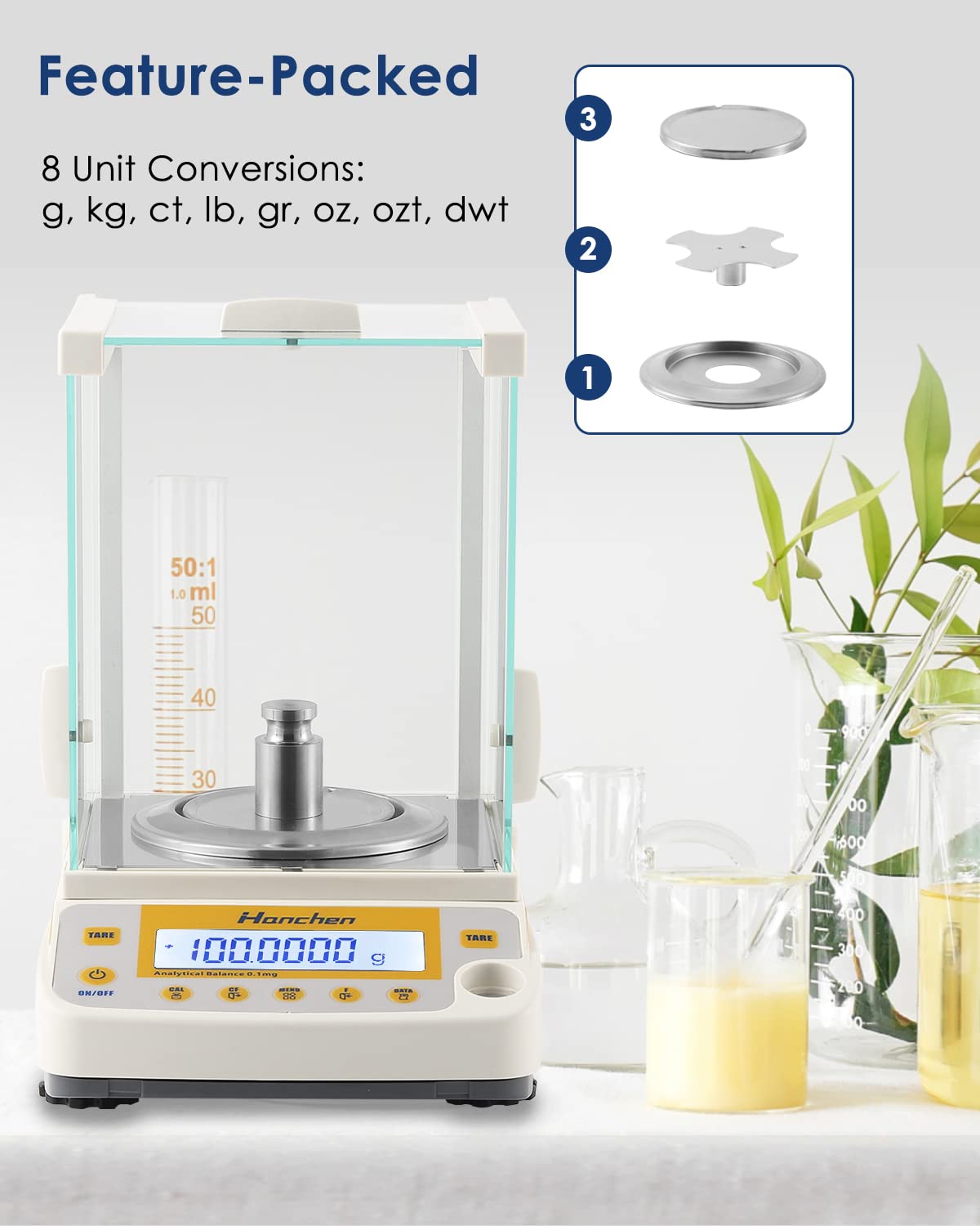 Featuring 3-sided glass draftshield, compact design electromagnetic load-cell and stable base, this 0.1mg analytical scale can eliminate the effect from air flow, tiny shake and temperature shifts, and thus comes out readings with very high repetibility, helping you pass the strict qualification process. English Manual, 24hrs response and with 1 year free guarantee.
