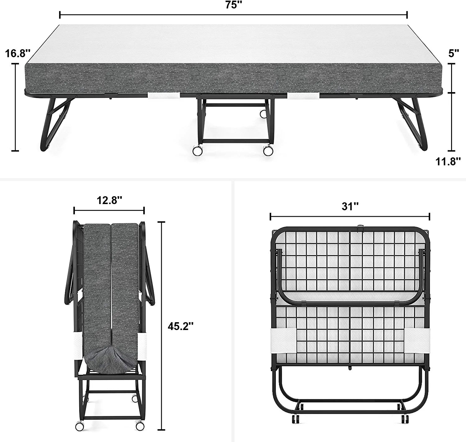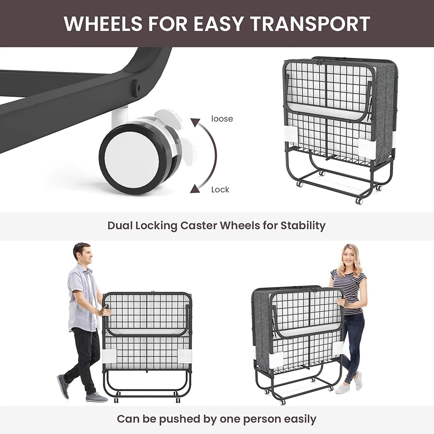 Folding Rollaway bed with mattress for adults with Memory Foam Mattress and Metal Frame on Wheels I 75” x 31"