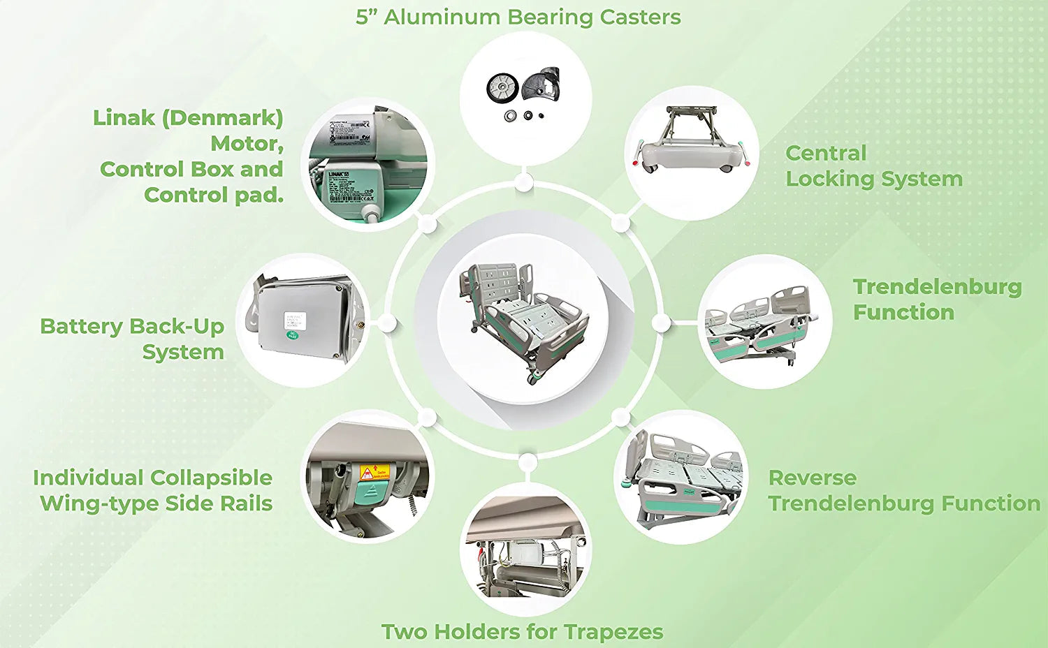 electric motor actuator and control system offers smooth and quiet movements. The electric motor system is developed in Denmark and is the leading brand for hospital beds in the world. Their intuitive design allows patients to move to comfortable positions with the press of a button. In addition, the bed has the battery backup system for the emergency non-electric power.