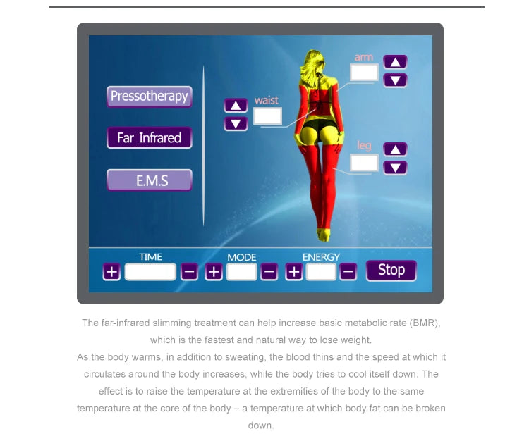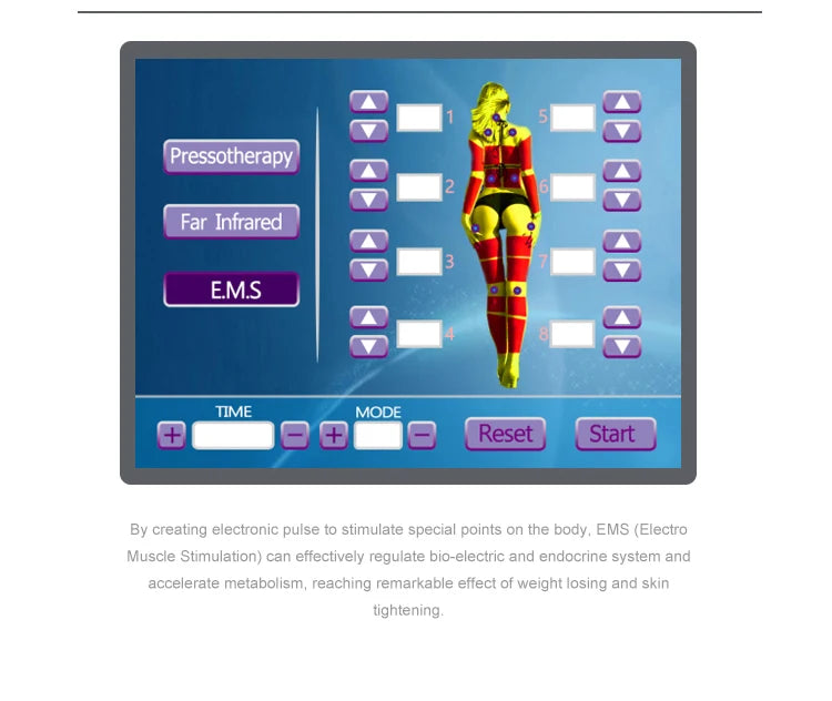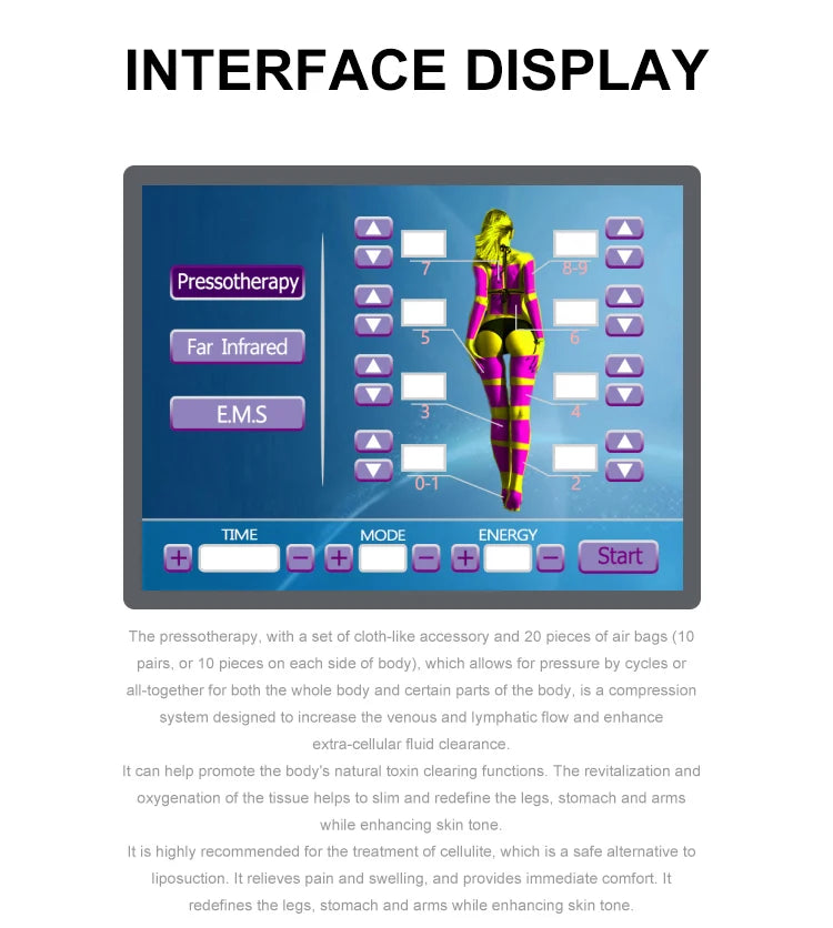 Pressotherapy: Harness the power of compression therapy with 10 air bags and cloth-like accessories, promoting venous and lymphatic flow, detoxification, cellulite reduction, pain relief, and improved skin tone.