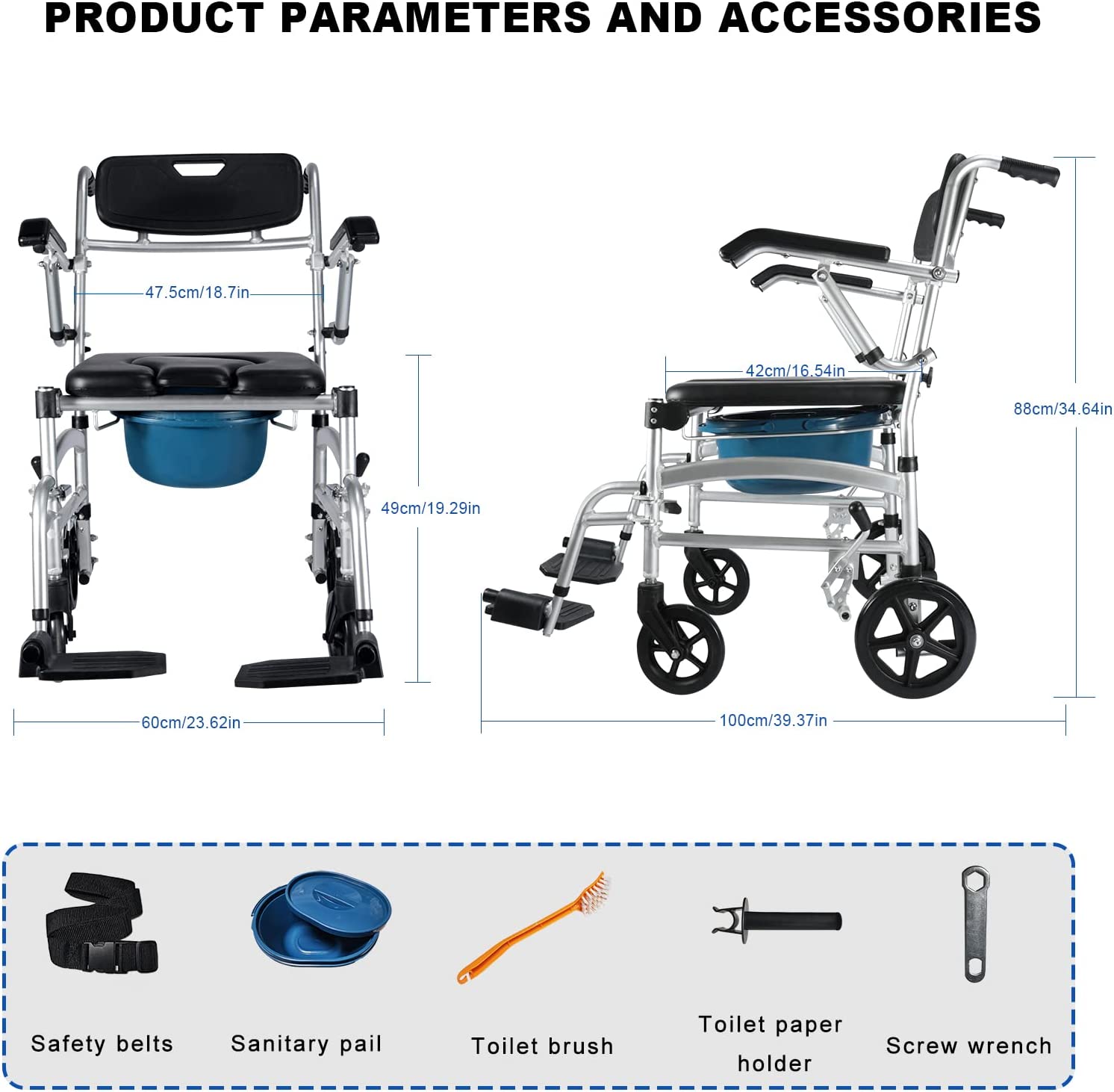 This chair has a variety of uses, can be used as a shower chair, wheelchair, bedside commode chair, you can also take the potty off the toilet and sit directly on the toilet as a toilet safety rack.