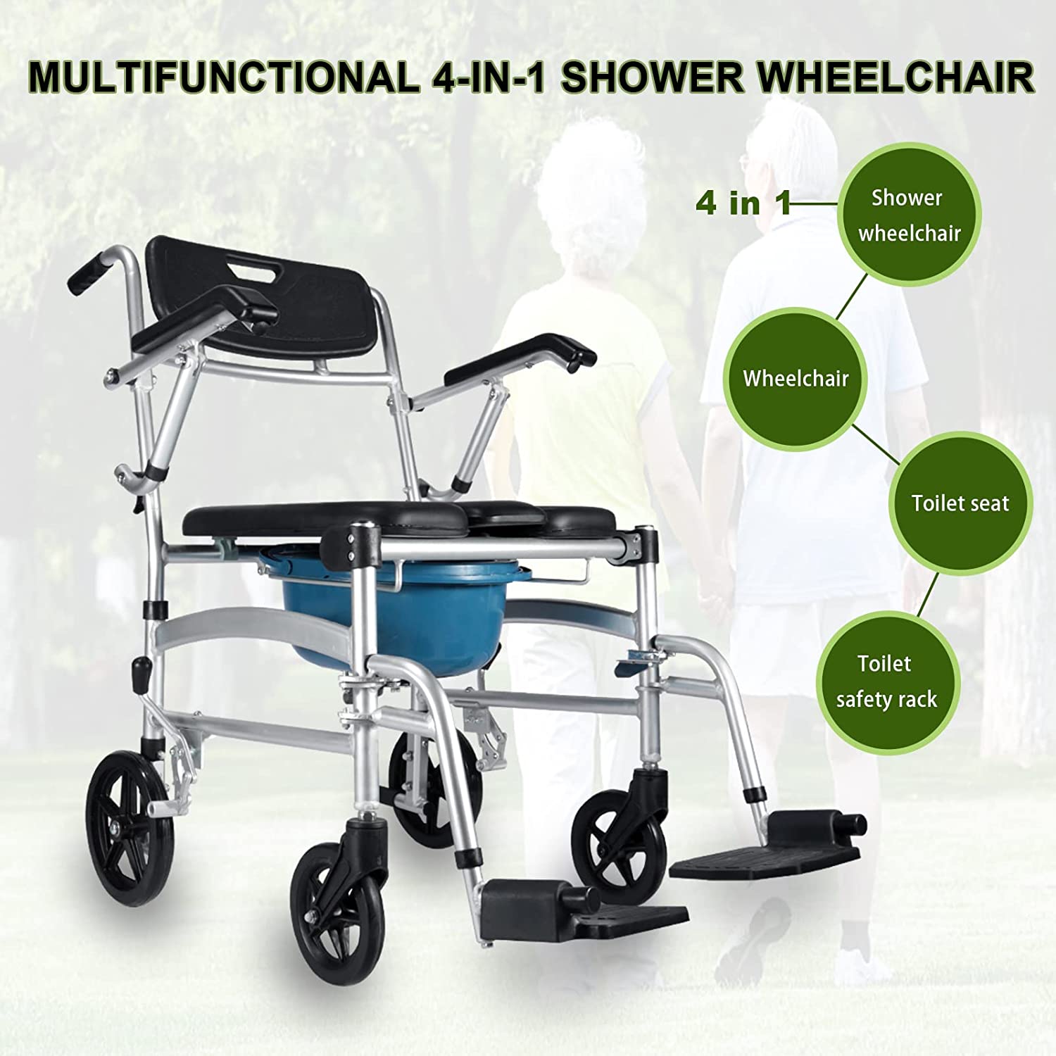 4-in-1 Foldable Shower Wheelchair I Bedside Commode Chair I Shower Chair with Wheels I
