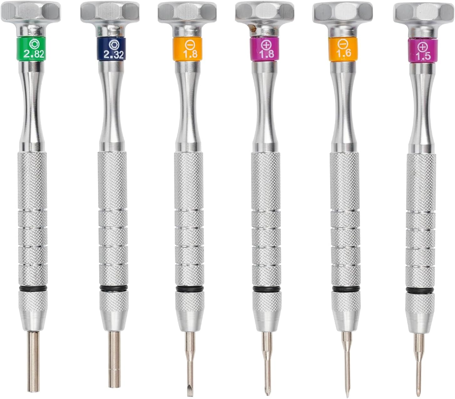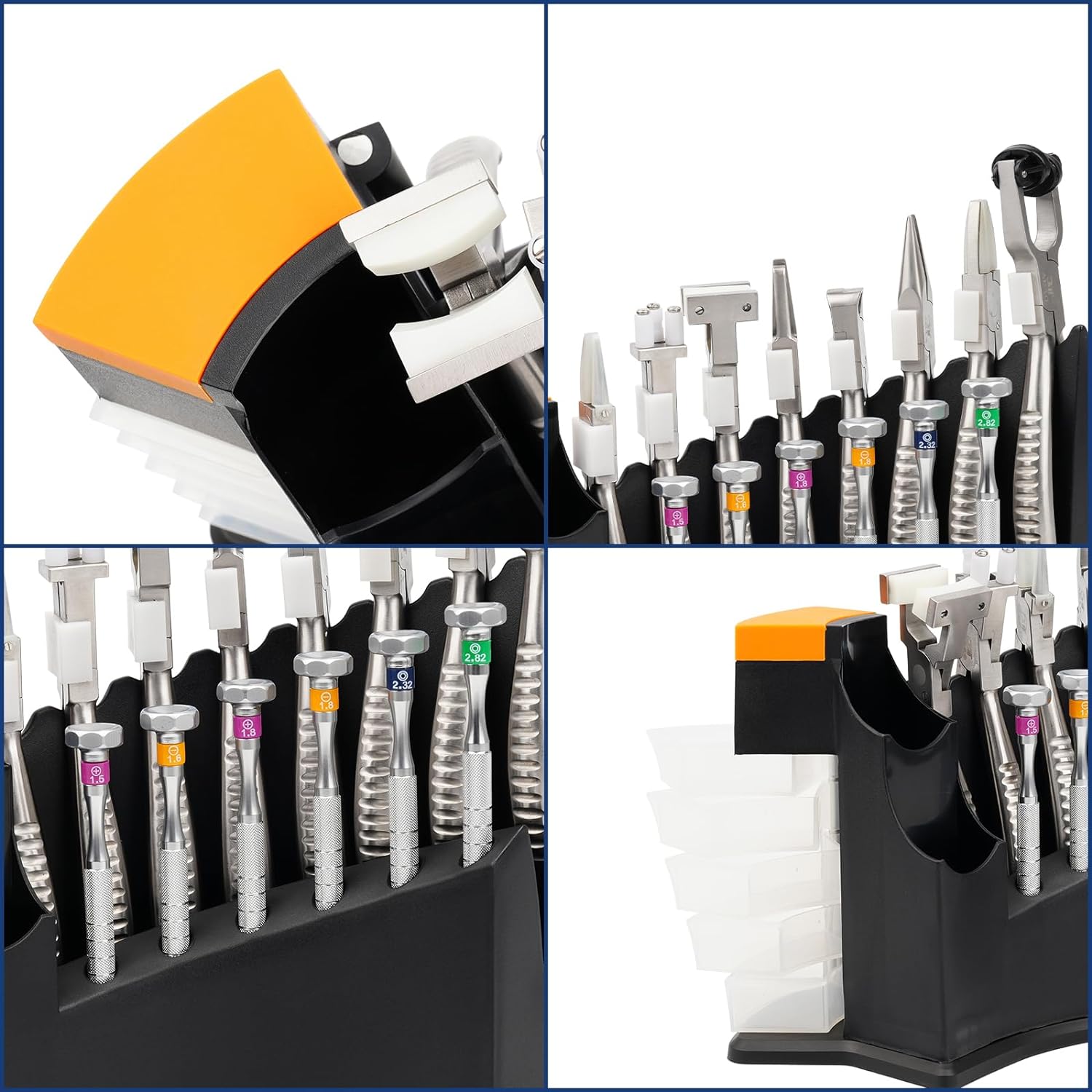 Additionally, the kit boasts 6 screwdrivers, covering the most common sizes for eyewear repairs, including one screw, Phillips, star, and hexagonal screws. Organized in a convenient holder, this set is perfect for display on counters or shelves.