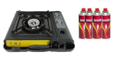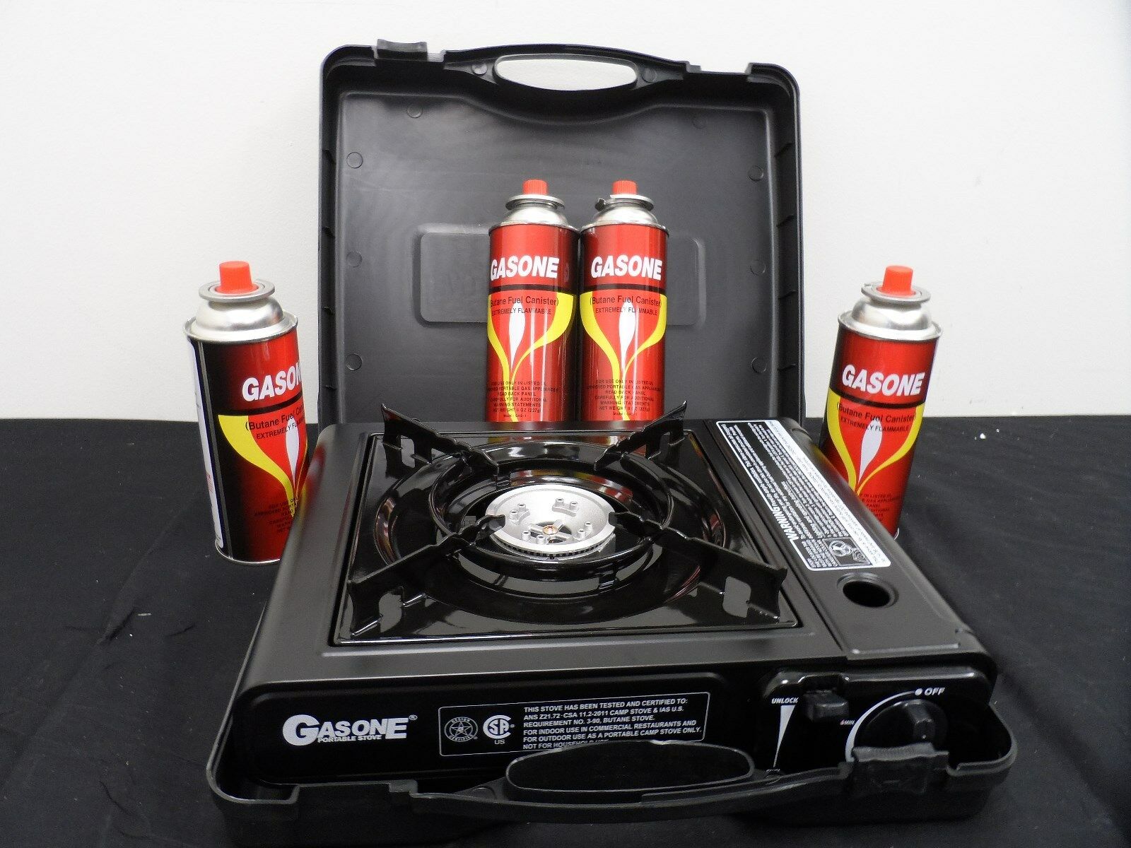 This new butane camping stove has Aluminum & Steel Construction, with built-In self-ignition.  The stove can produce heat  9000 BTU and is fueled by a self-contained canister of butane gas.  The package includes a free carrying case and 4 cans of butane! Perfect for Camping, Boating, Picnics, Tail Gating, Fishing, Cooking Outdoors, Emergency Power Outages, and more.
