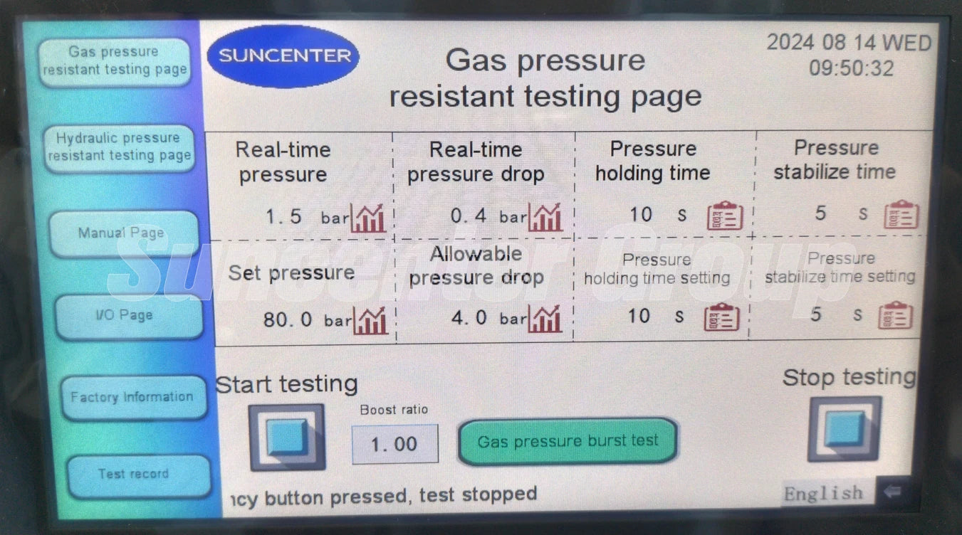 - Activate the touch screen and enter the "Gas pressure testing" page. Set parameters such as pressure, pressure drop, holding time, and stabilization time.