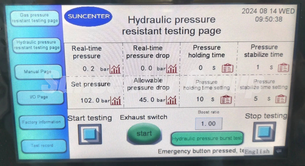 - For a burst test, select "Hydraulic pressure burst test" to increase pressure until the object bursts, and the machine will record the burst pressure.