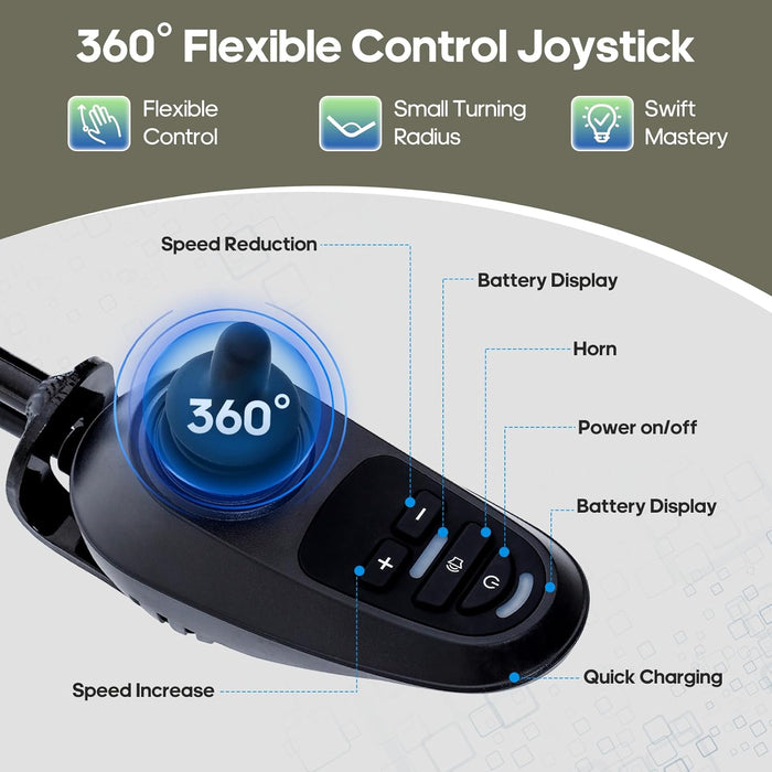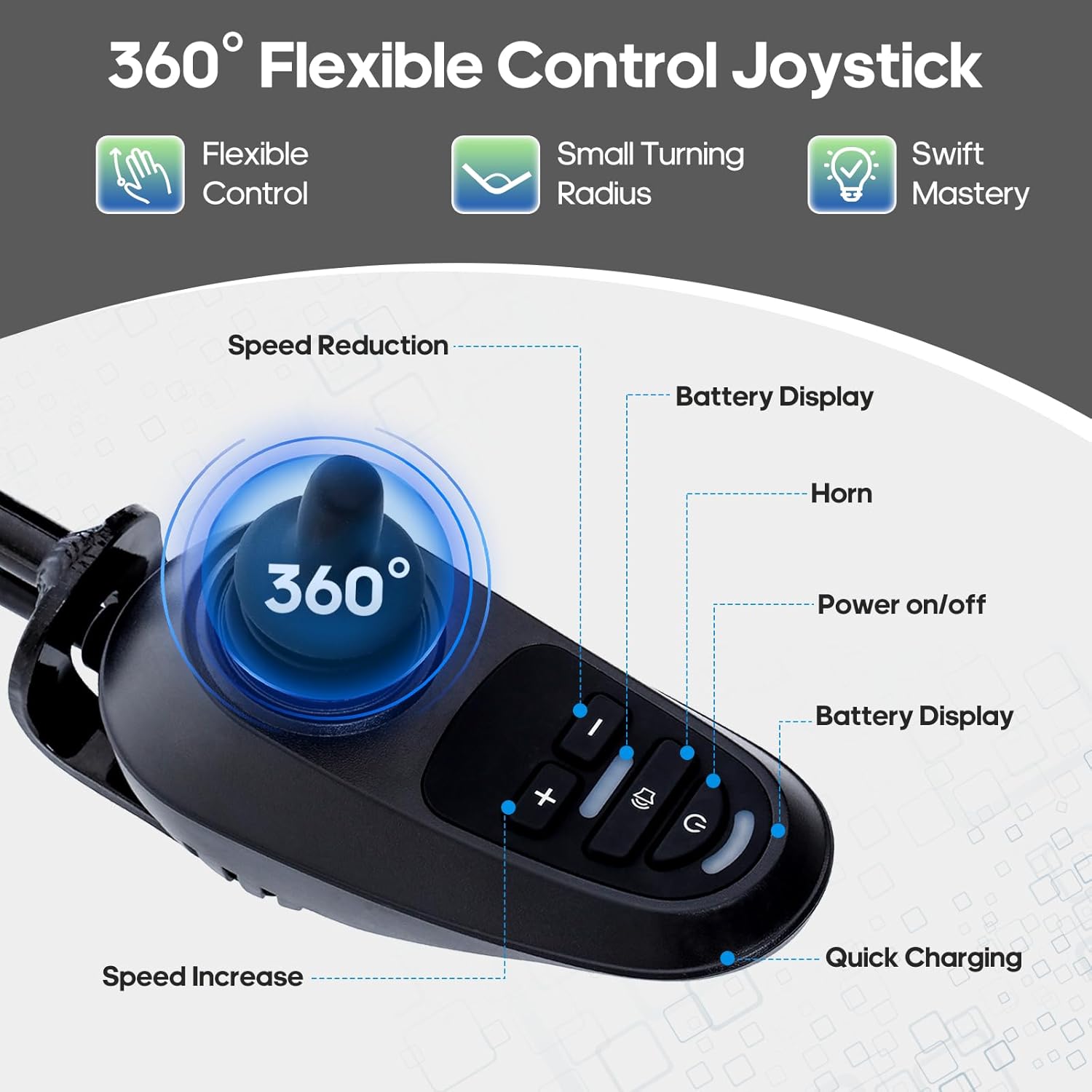 The intuitive 360-degree joystick ensures easy control, even in tight spaces. This wheelchair is powered to navigate various terrains, including slopes and uneven surfaces, with ease. The responsive joystick allows smooth maneuvering and precise braking, even in confined areas.