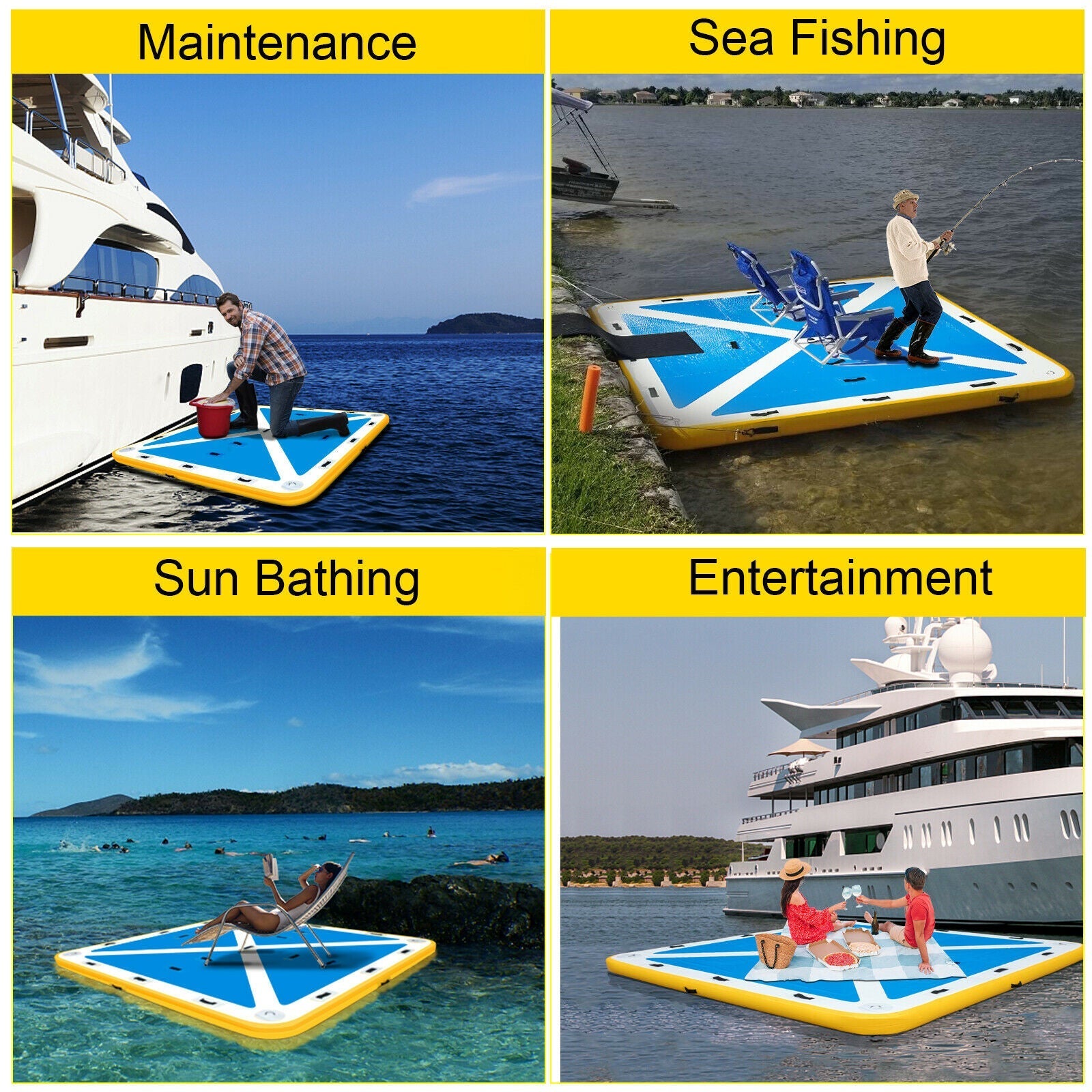 The inflatable dock is a luxurious 8 ft x 8 ft extended swim platform with non-slip pads and D-rings anchors to increase security. It gives you additional space for lounging, swimming, and relaxing.