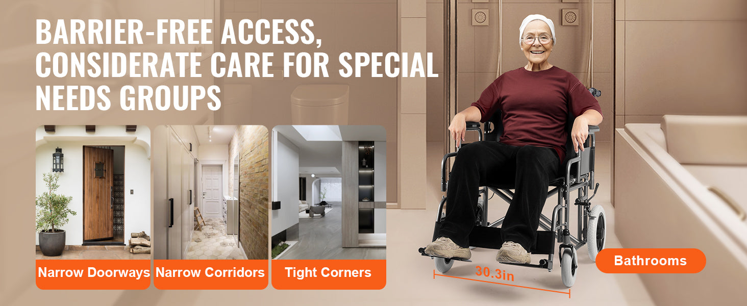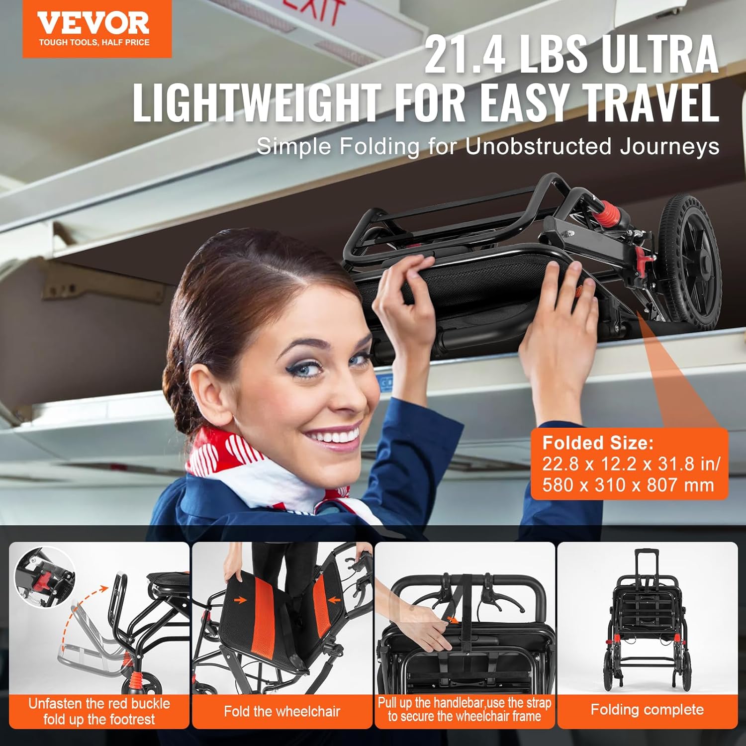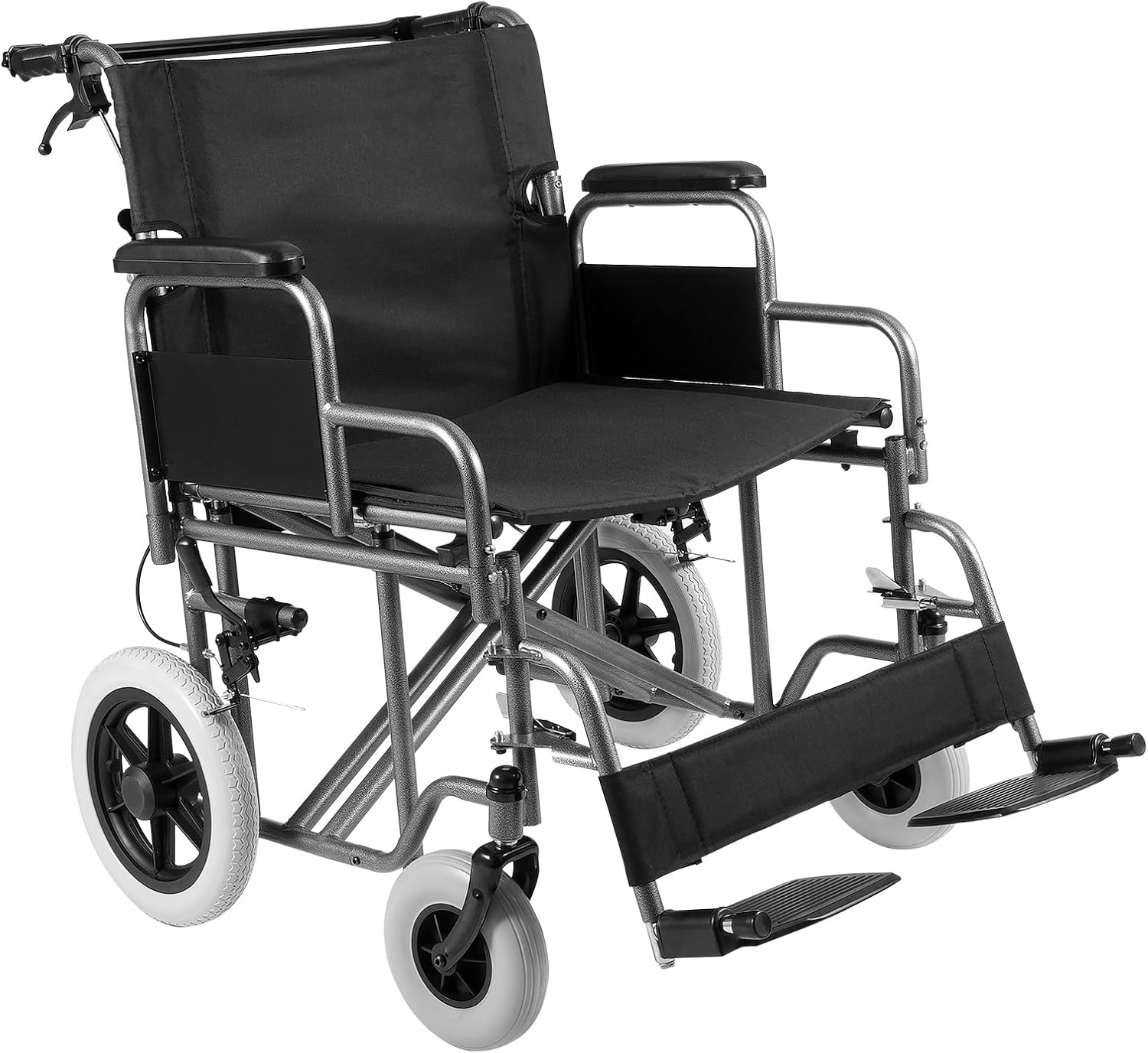 Carbon Steel Transport Wheelchair for Adults: Crafted for comfort and durability, this wheelchair features a robust carbon steel frame with a 24-inch wide seat, supporting up to 300 pounds. The one-touch folding design ensures easy operation, making it simple to store and transport, fitting effortlessly into car trunks for hassle-free travel.