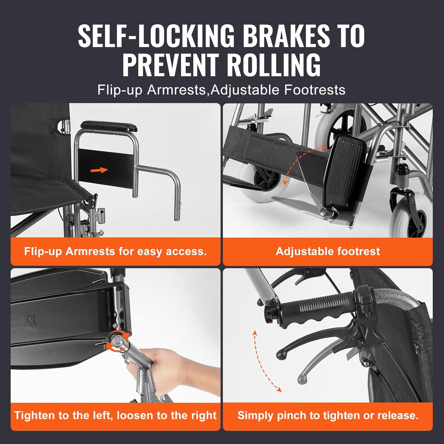 Self-Locking Brakes for Enhanced Safety: This wheelchair is equipped with self-locking brakes to prevent accidental movement, ensuring user safety. The detachable armrests provide convenience for easy boarding and exiting, while the adjustable footrest height (from 3.2 to 7.1 inches) caters to different user needs.