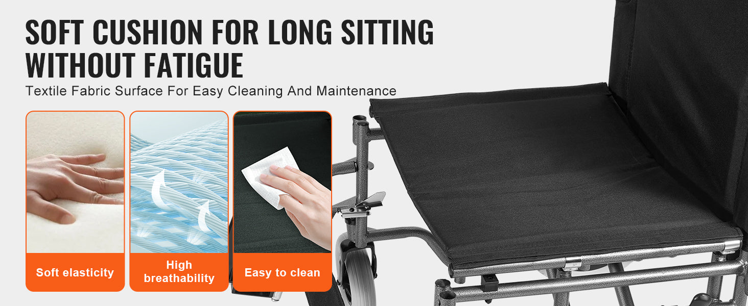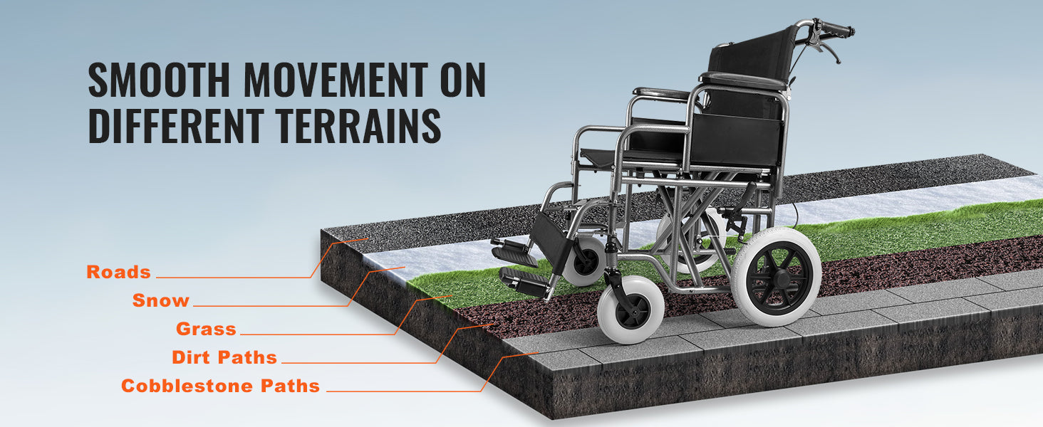 Durable, Puncture-Proof Tires: The wheelchair comes with solid, shock-absorbing tires that are puncture-proof, enhancing propulsion efficiency. These durable tires feature deep tread patterns that provide excellent traction, ensuring smooth and stable handling across various terrains.