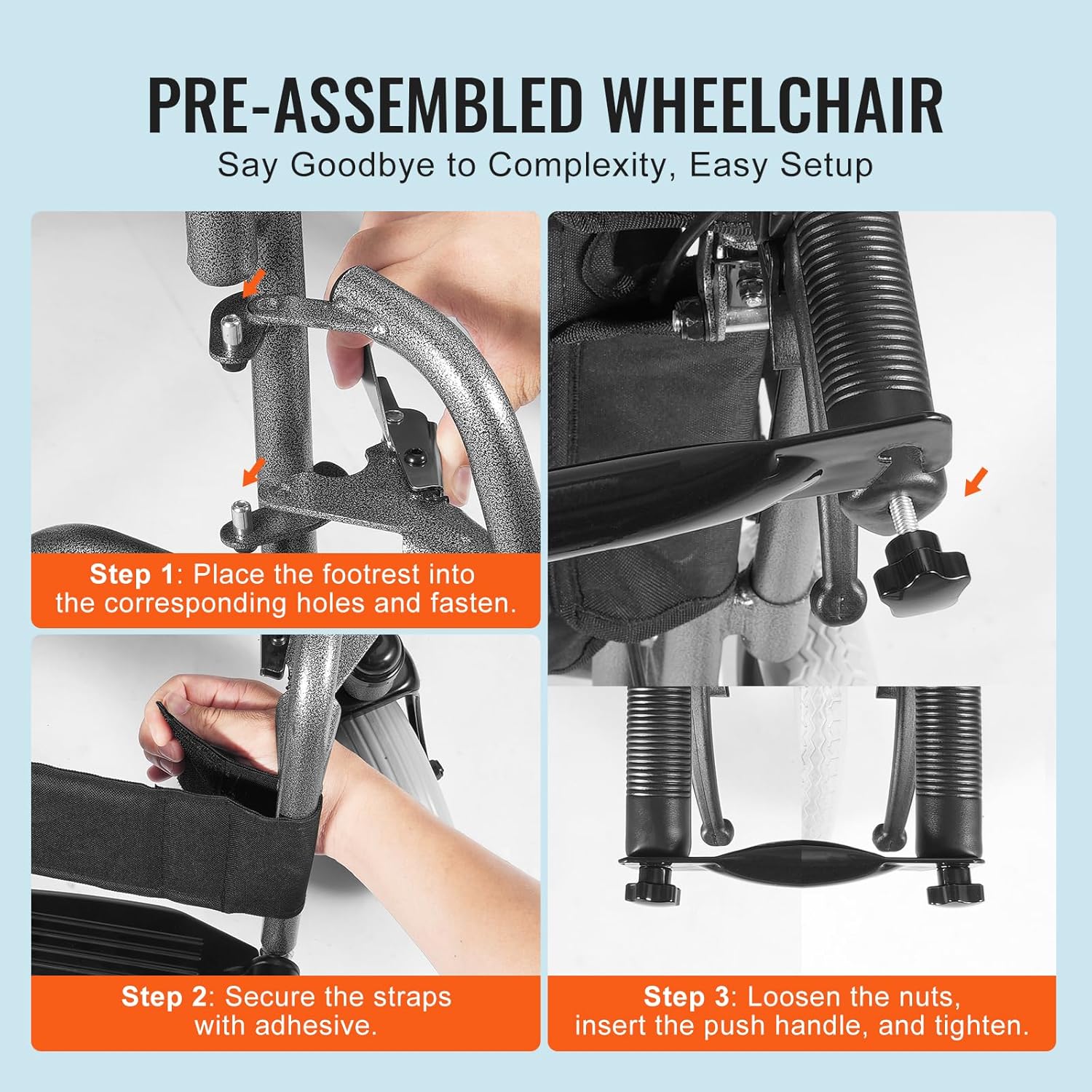 Easy Assembly: Designed for convenience, the wheelchair comes with pre-installed components, making assembly quick and straightforward. Just follow a few simple steps to complete the setup and start using your wheelchair right away.