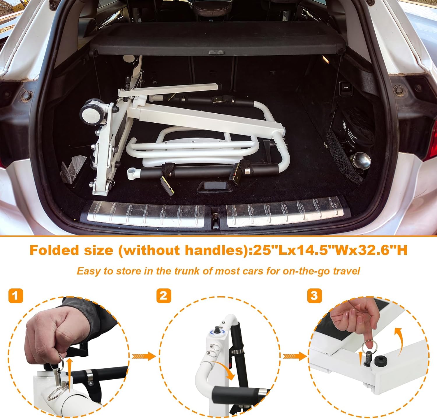 Our Wheelchair Lift for cars ensures effortless transfers, enabling long-distance travel, shopping trips, and more. Featuring a foldable design, it measures 25x14.5x32.6 inches when folded, allowing easy storage in a room corner or car trunk without the need for tools.