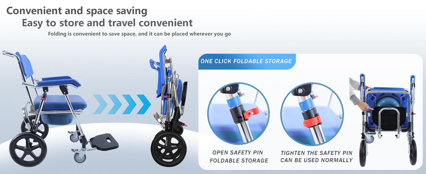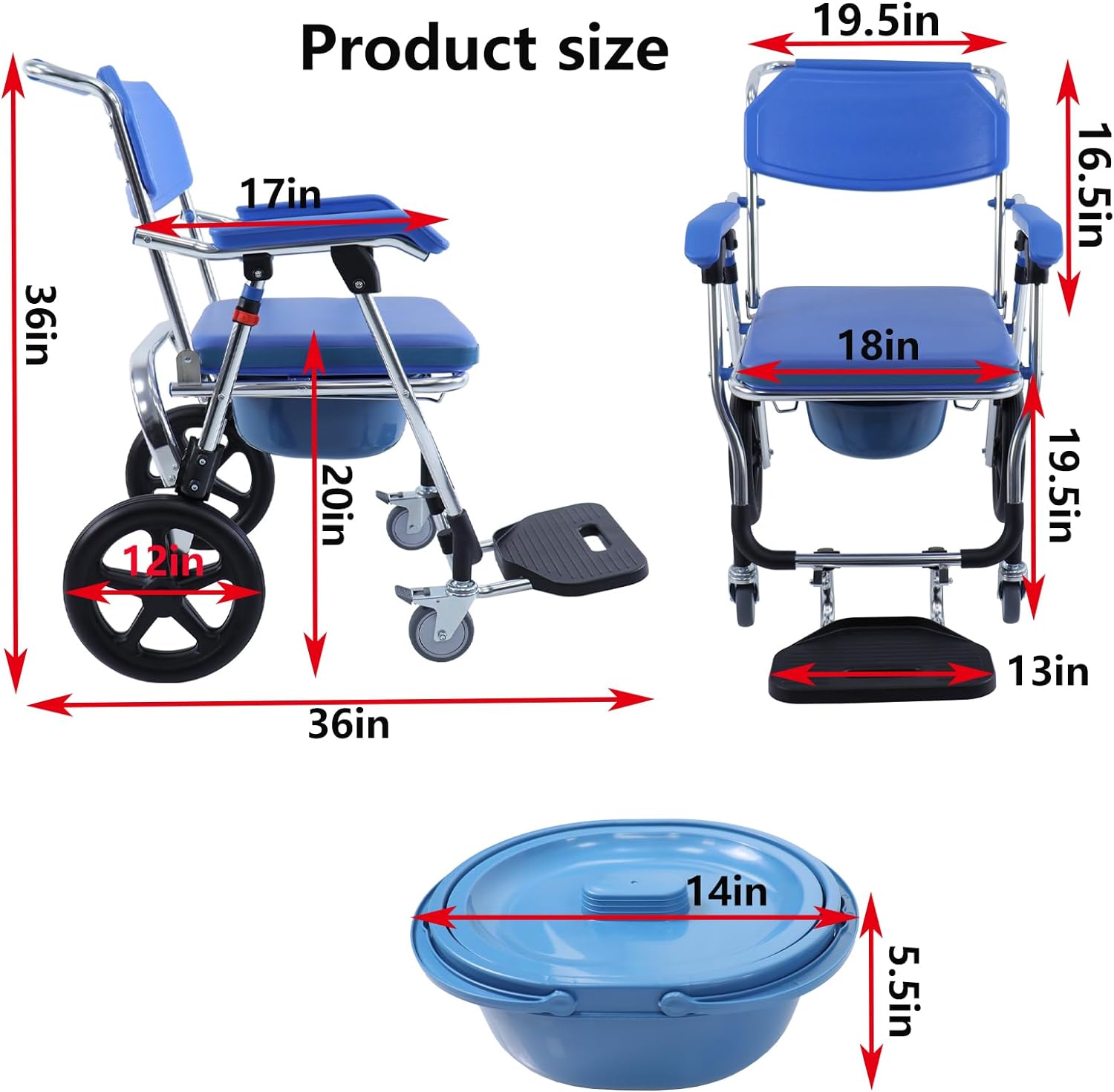Our Folding Shower Commode Wheelchair is the perfect 3-in-1 solution for seniors, disabled individuals, and caregivers. This multifunctional chair serves as a beside commode chair, rolling shower chair, and transport wheelchair, offering ultimate convenience at home or on the go.