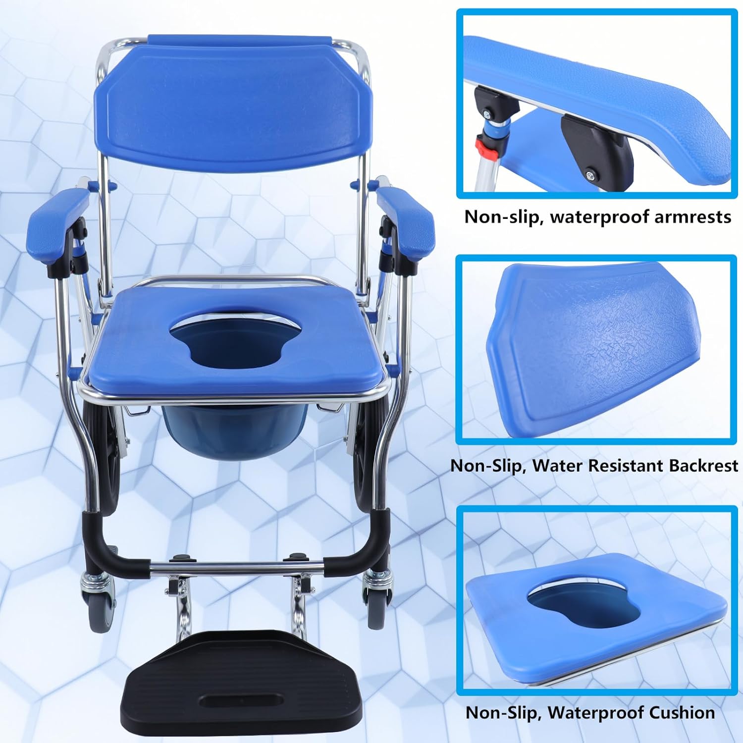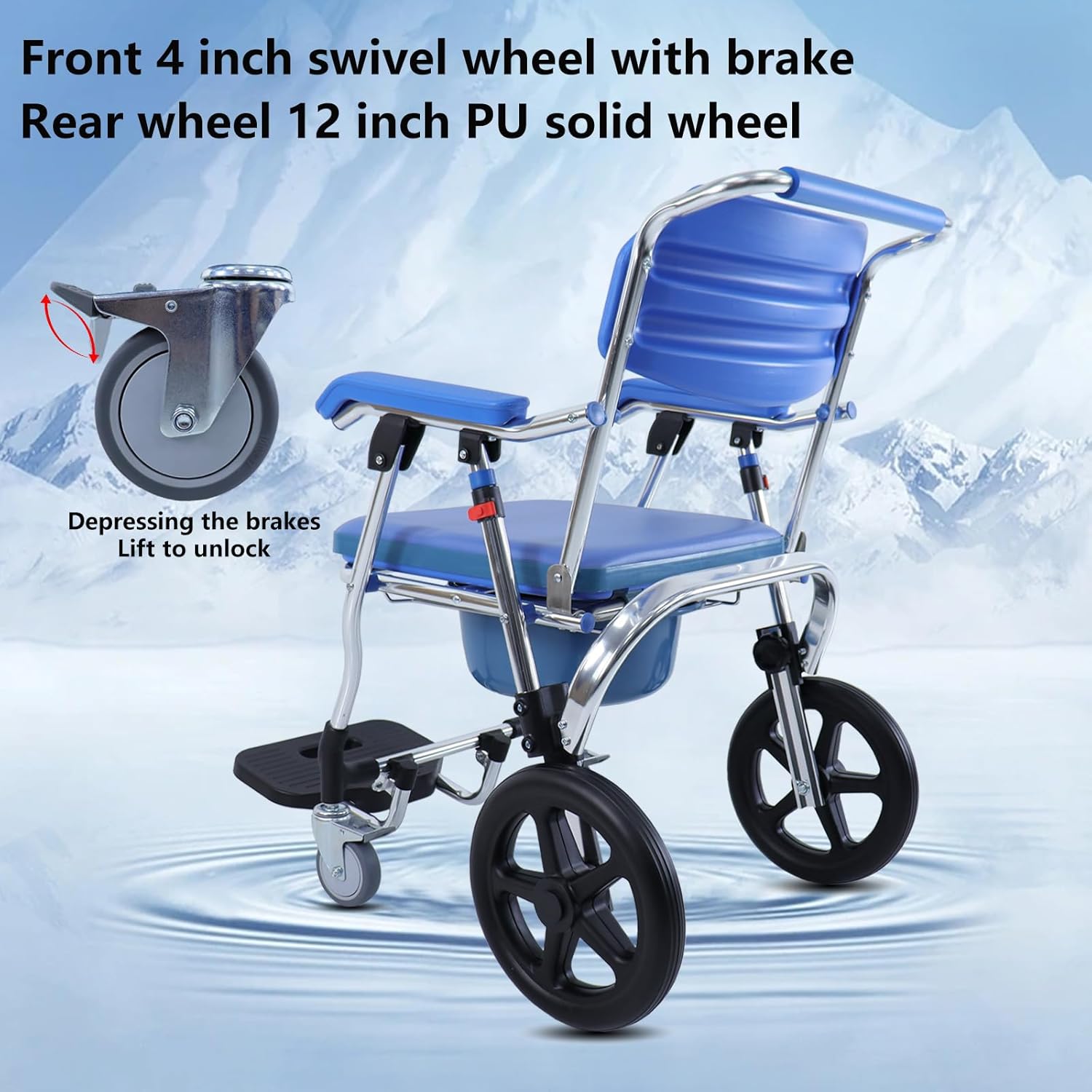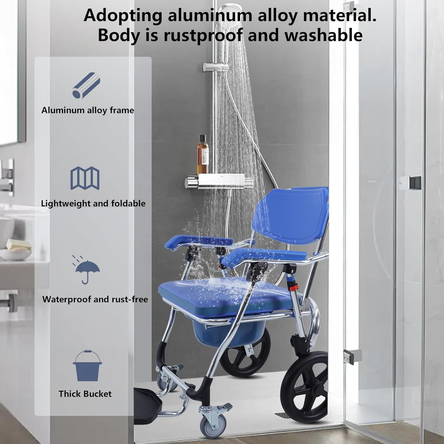 Folding Shower Commode Wheelchair - 300lbs Capacity, Waterproof, Padded Seat, Rolling Shower Chair