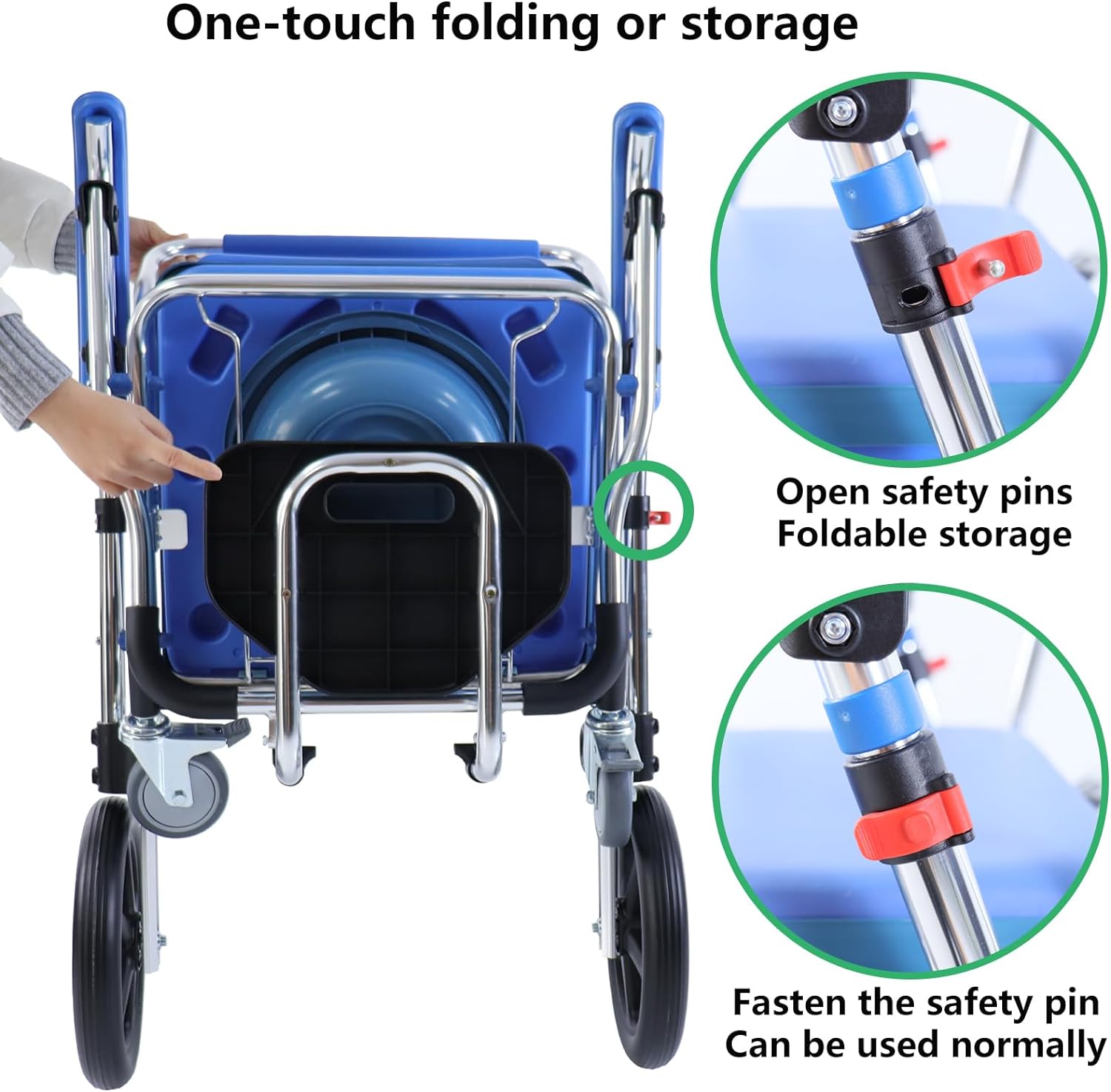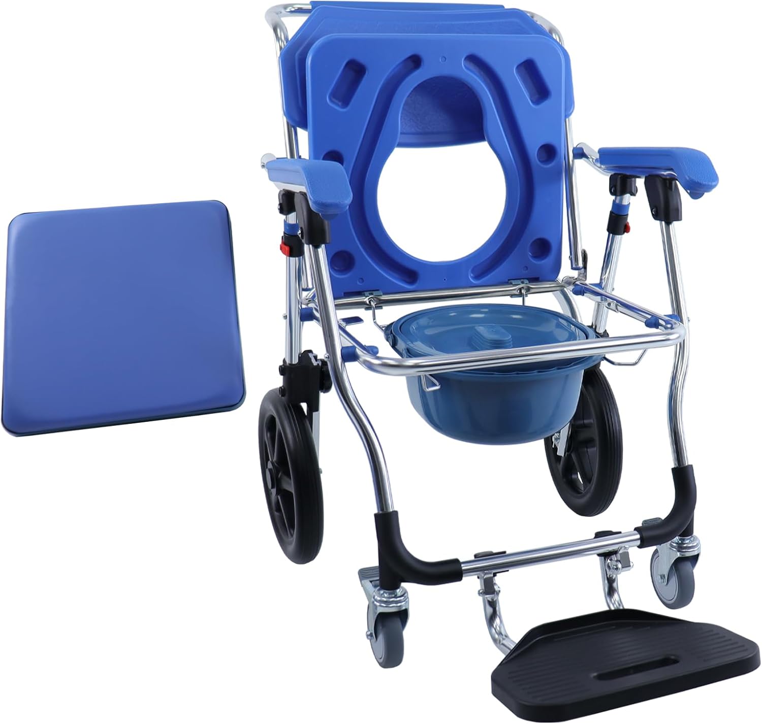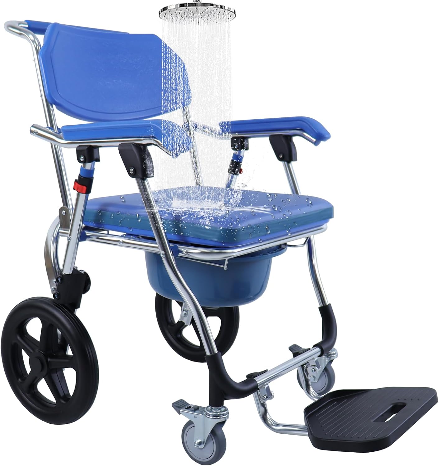 Folding Shower Commode Wheelchair - 300lbs Capacity, Waterproof, Padded Seat, Rolling Shower Chair