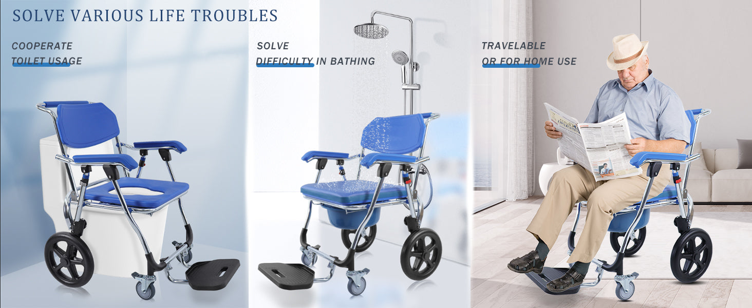 Ideal for small showers, elderly care, and home recovery, this all-in-one folding shower wheelchair with wheels brings mobility, safety, and dignity to your daily routine.