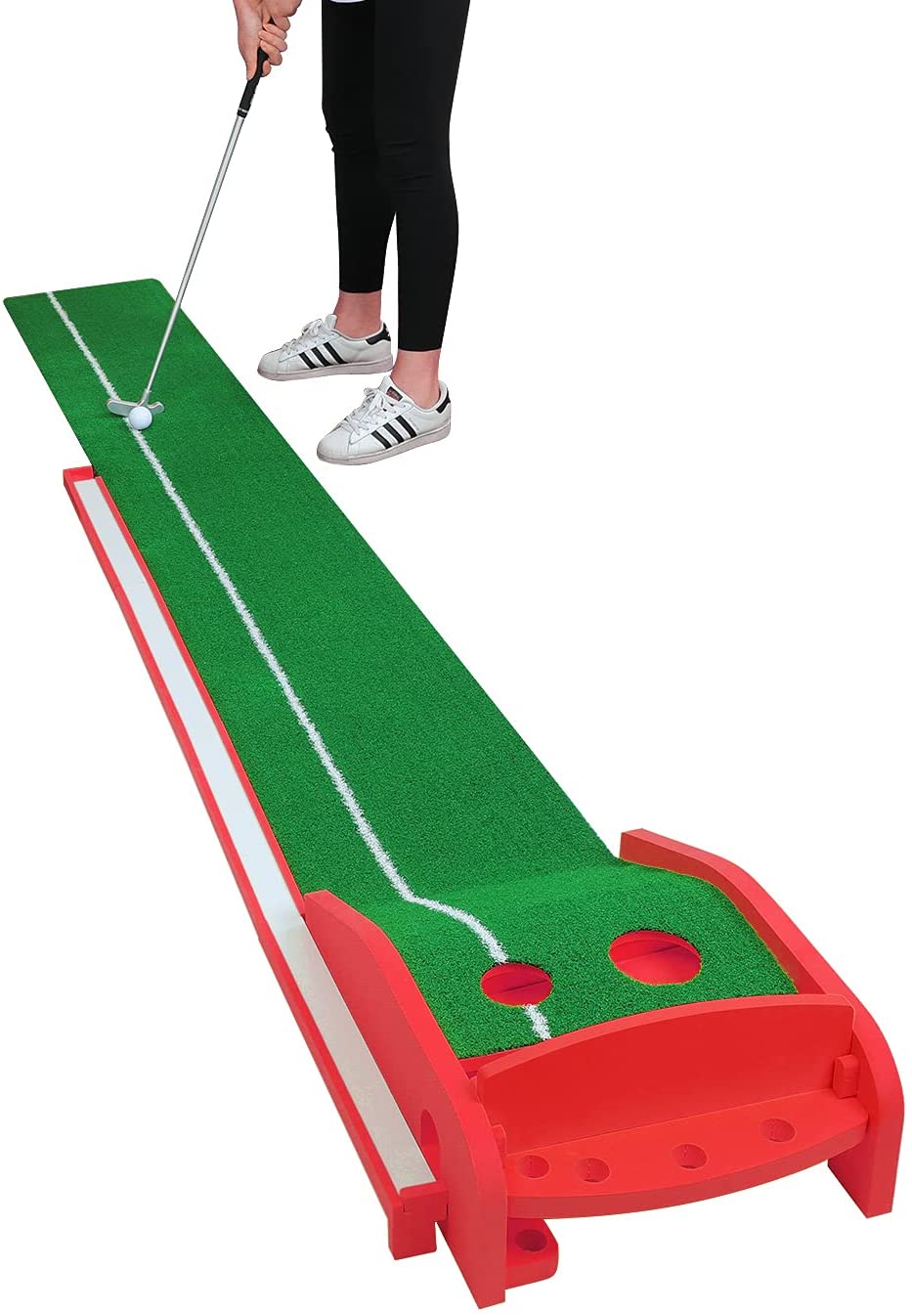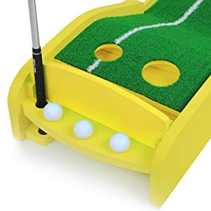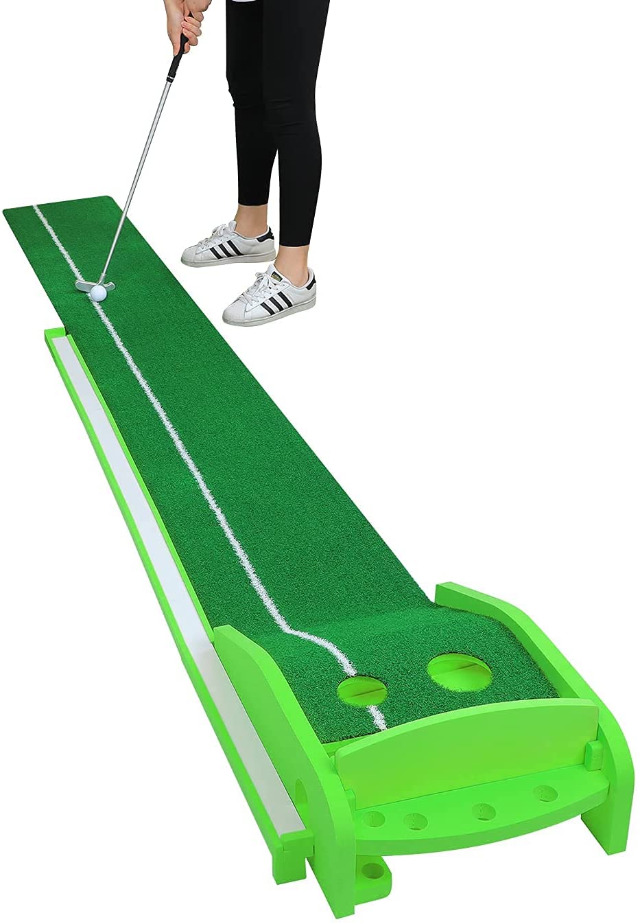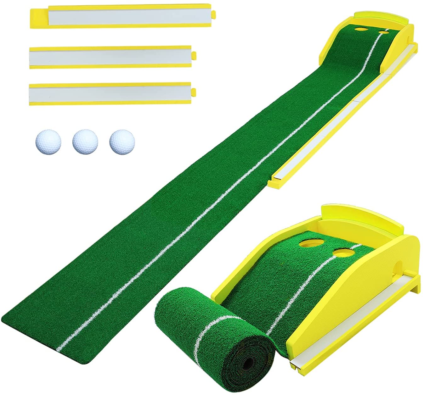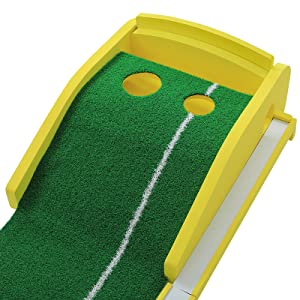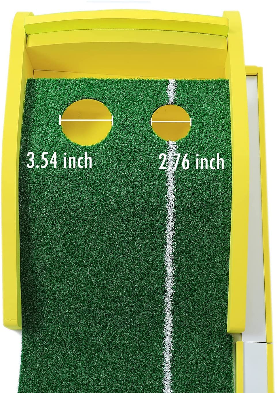 - No Hassle to Pick Up the Ball: With the ball return system, the ball will get back to you all the way through the track smoothly, The turf is made of simulated grass which can provide you true roll, the rubber bottom will never slip away. It come with 2 holes, the bigger hole is 3.54inch in diameter, the smaller one in 2.75inch with alignment line is more challenge to refine your putting skill.