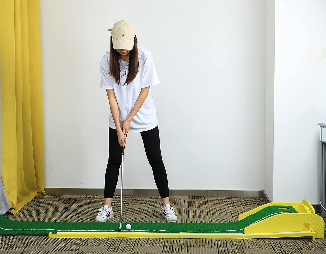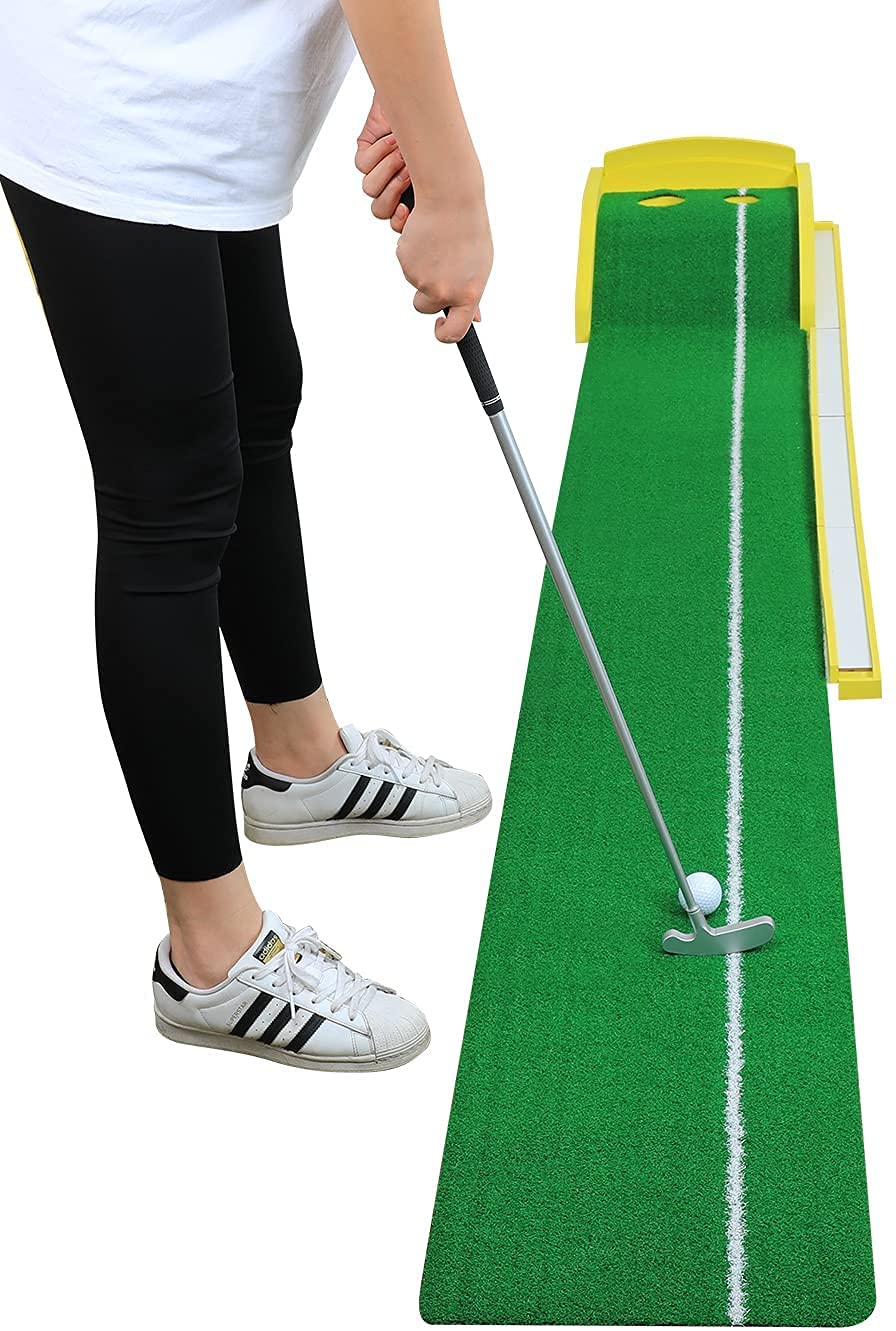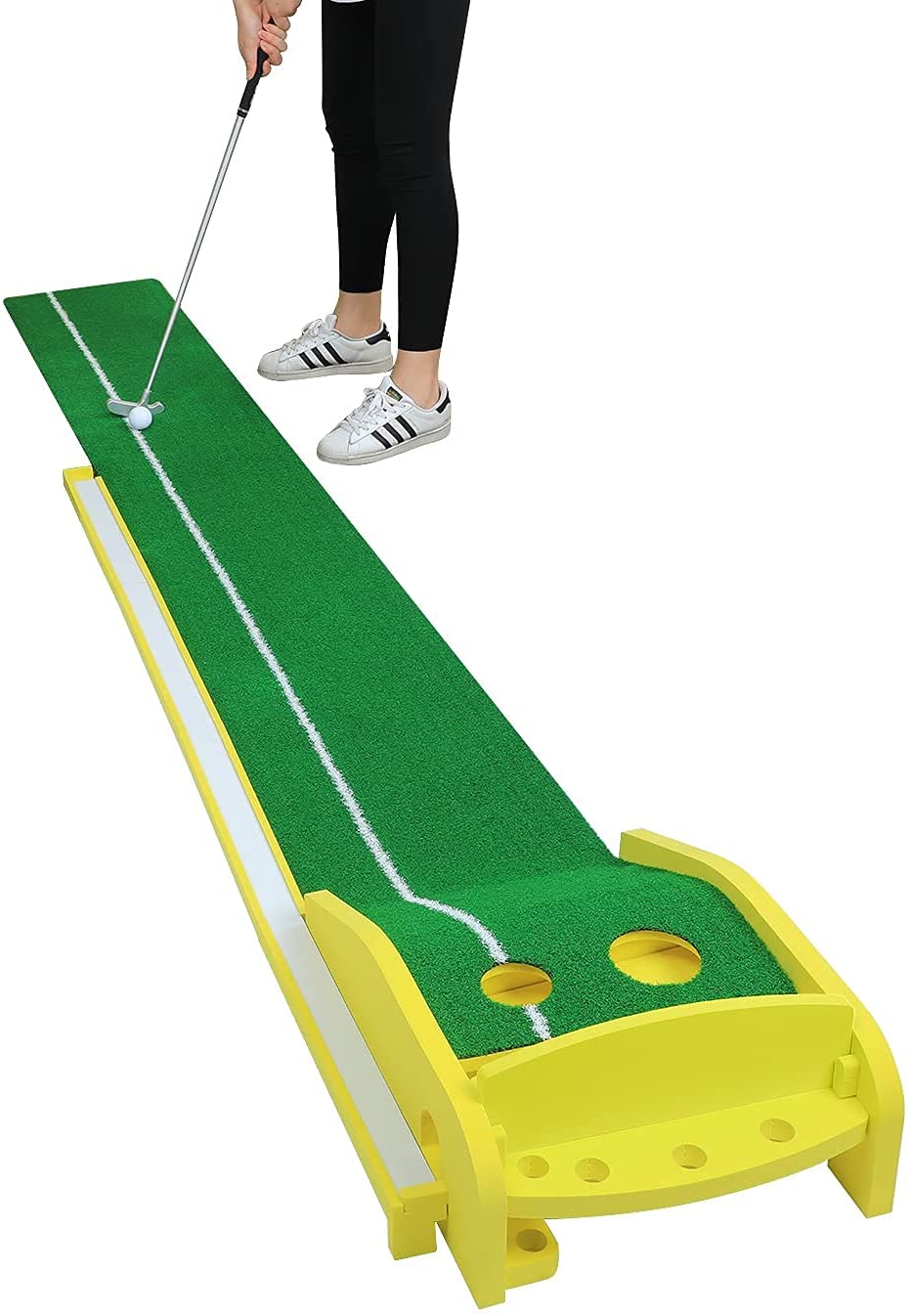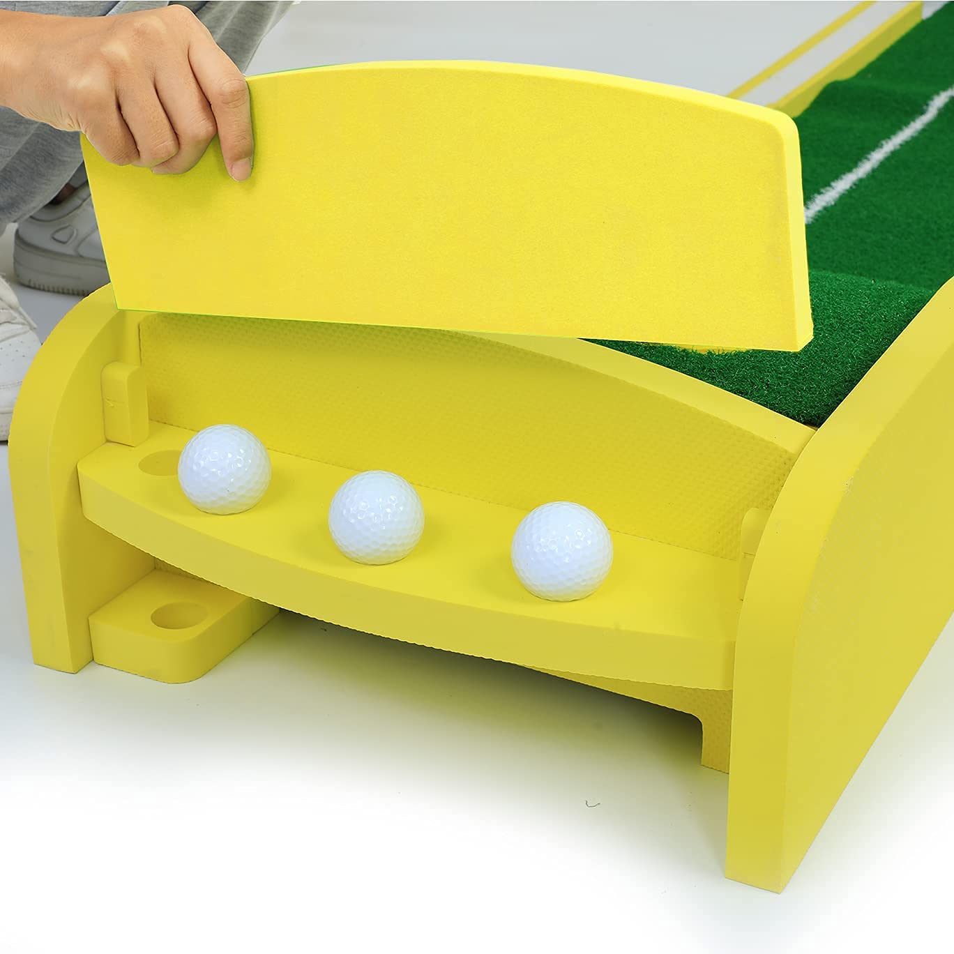 - No Hassle to Pick Up the Ball: With the ball return system, the ball will get back to you all the way through the track smoothly, The turf is made of simulated grass which can provide you true roll, the rubber bottom will never slip away. It come with 2 holes, the bigger hole is 3.54inch in diameter, the smaller one in 2.75inch with alignment line is more challenge to refine your putting skill.