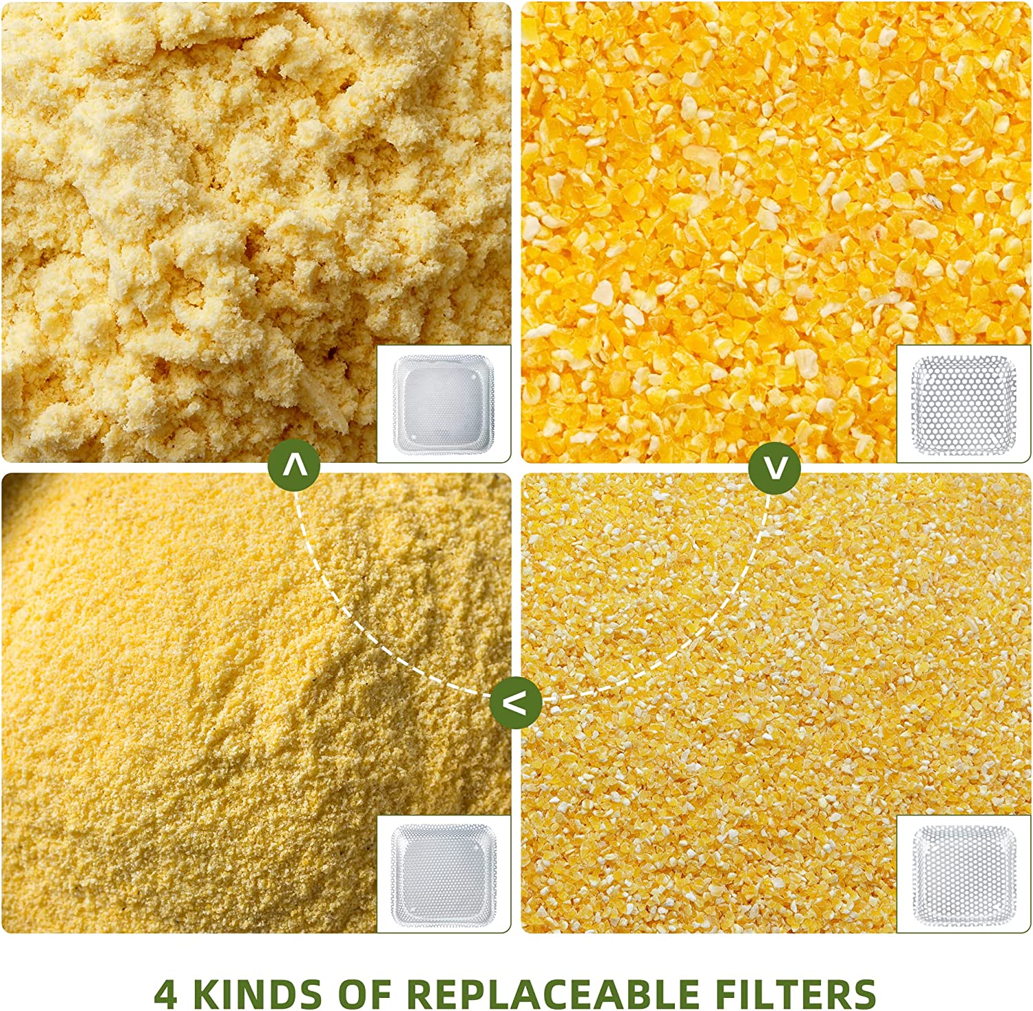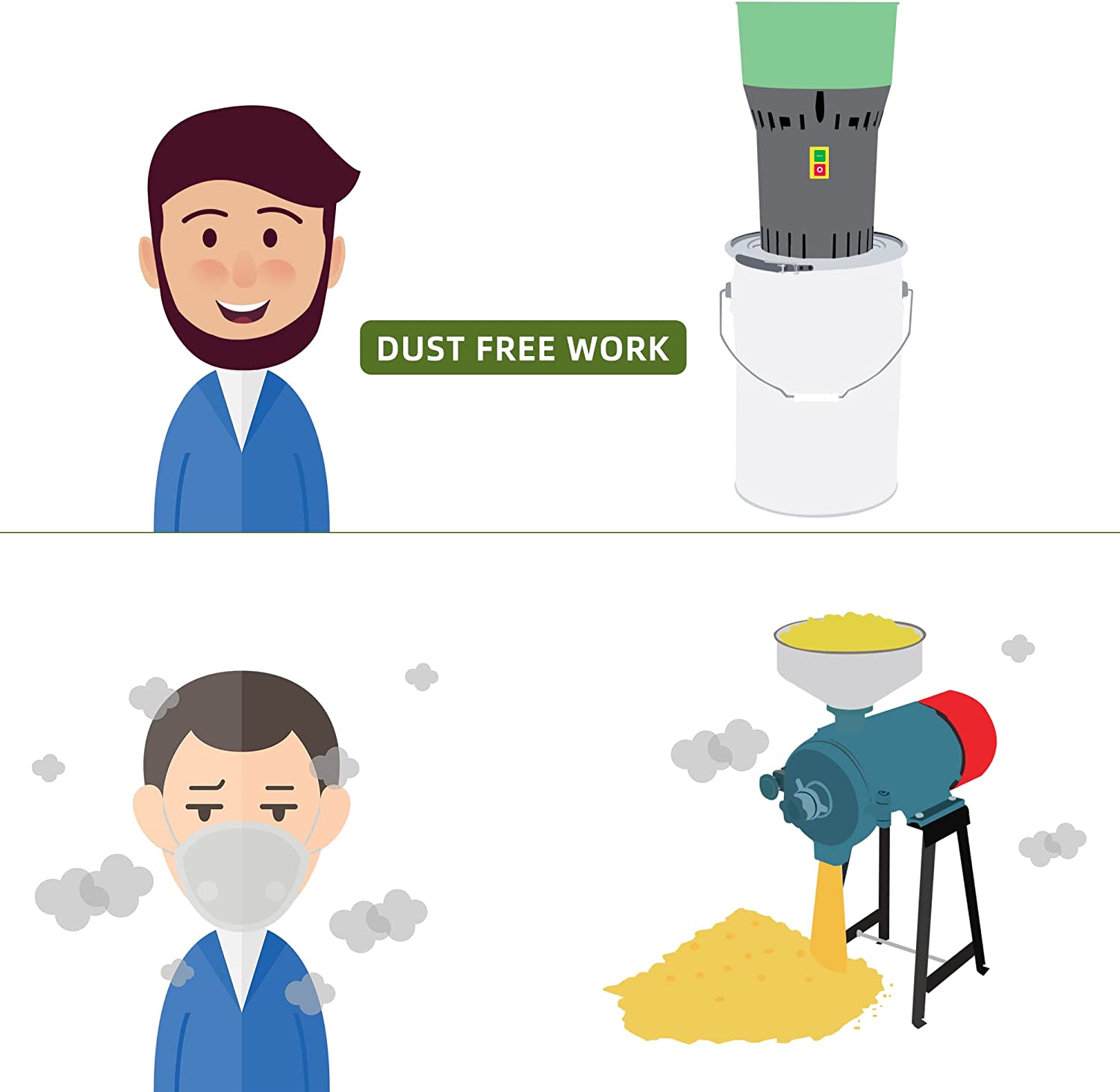 The mill is completely dust-free, with all grains ground through a green feeding port and the finished product going directly into a white storage bucket, eliminating the possibility of dust generation. The mill also offers 4 filter modes to choose from, allowing you to grind grains into large, medium, small or powder state.