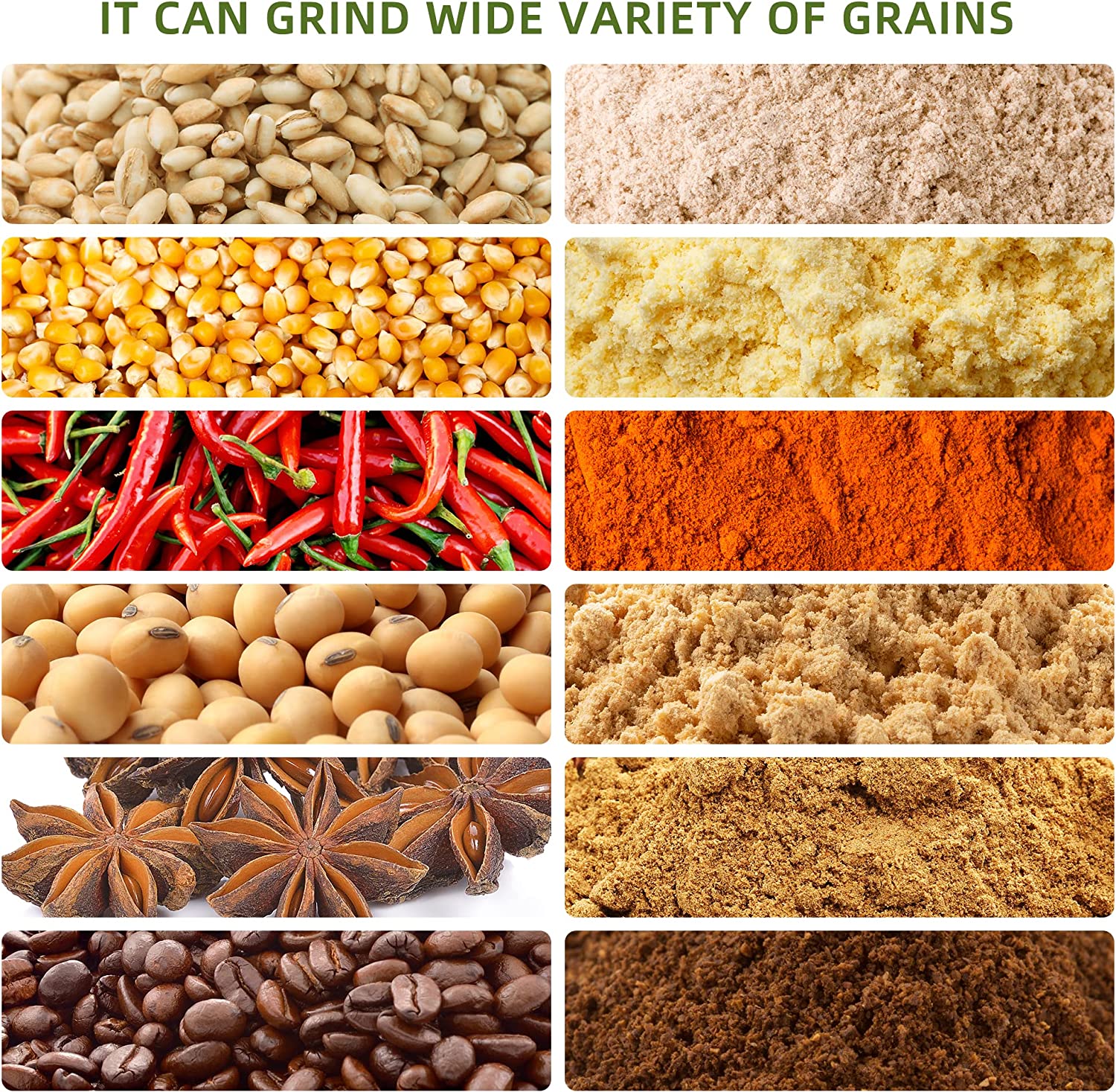 This electric grain mill is designed to be high-capacity and efficient, featuring a high-quality grinding core for consistent grain size. It can be used as a corn grinder, flour mill, wheat grinder, soy grinder or rice mill, as well as for grinding feed, spices, and herbs, with a capacity of up to 6.6 gallons.