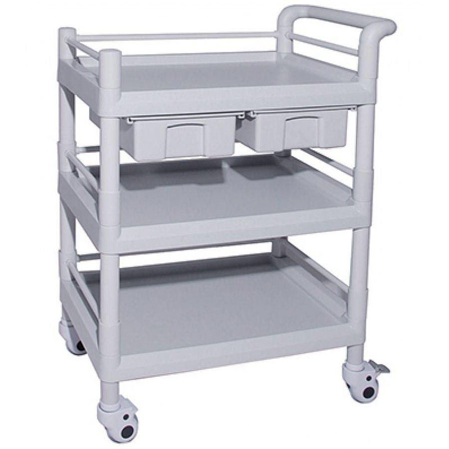 Sizeļ¼760*520*858mm 1.Mainly made of ABS 2.Three ABS platform board, easy to clean. 3.Two drawers 4.Four free-noise casters, two casters with brake,noise-free slides