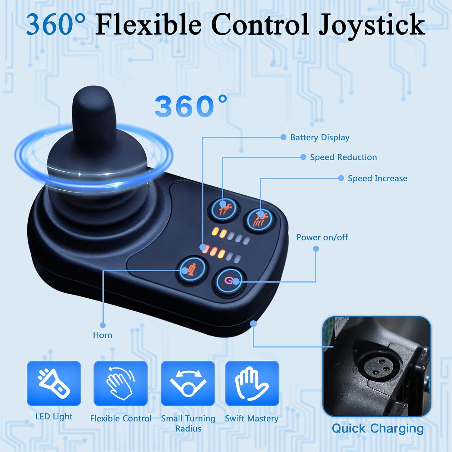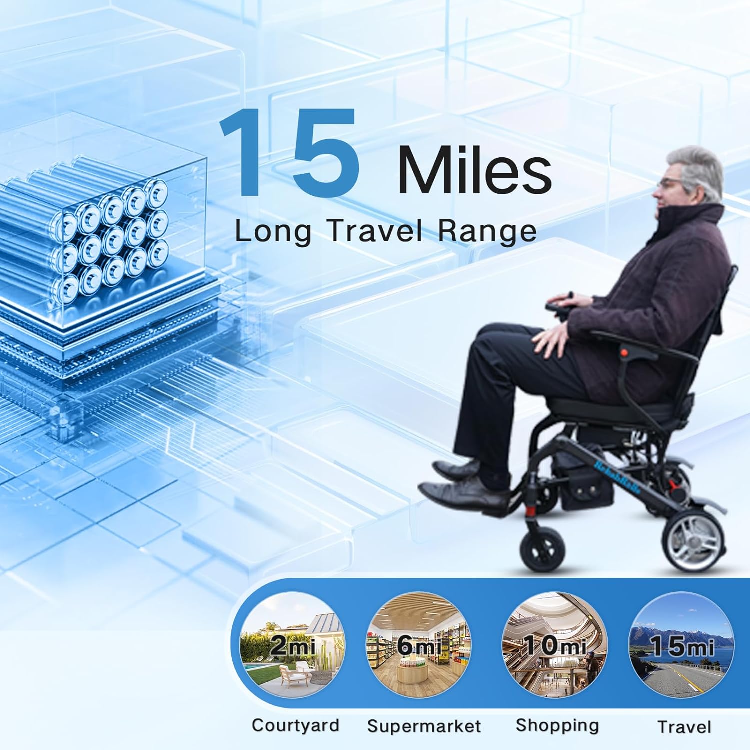15 Miles Long Range: Equipped with 24V 10AH lithium batteries, this wheelchair offers an impressive 15-mile range on a full charge. Please note that this mileage is the no-load mileage, and actual range may vary based on weight and weather conditions.