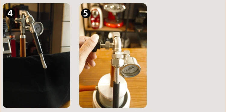 - Foam Creation: Close the black valve and wait until the pressure gauge indicates 3.5~4 bars before opening the black valve to create milk foam.