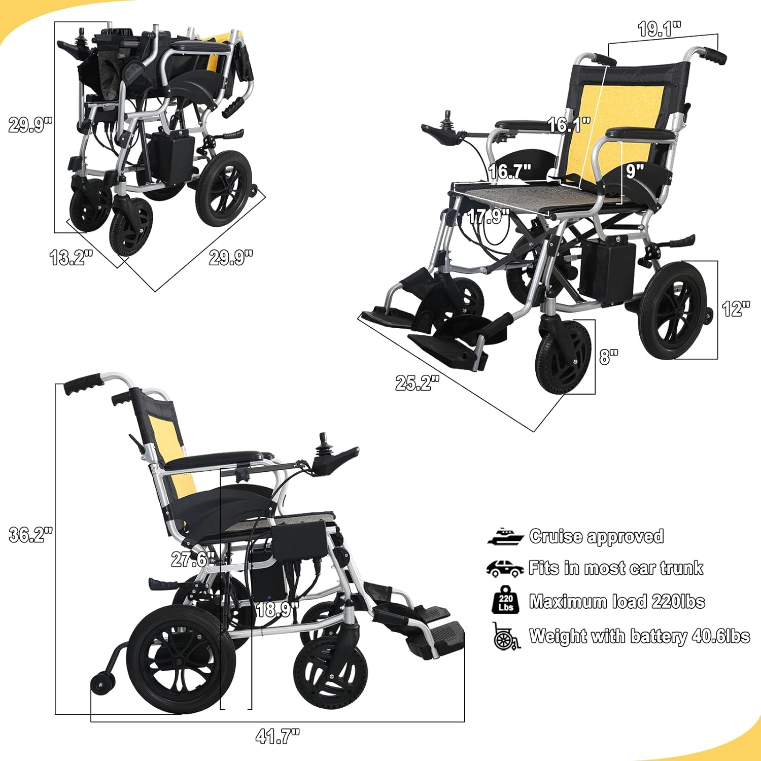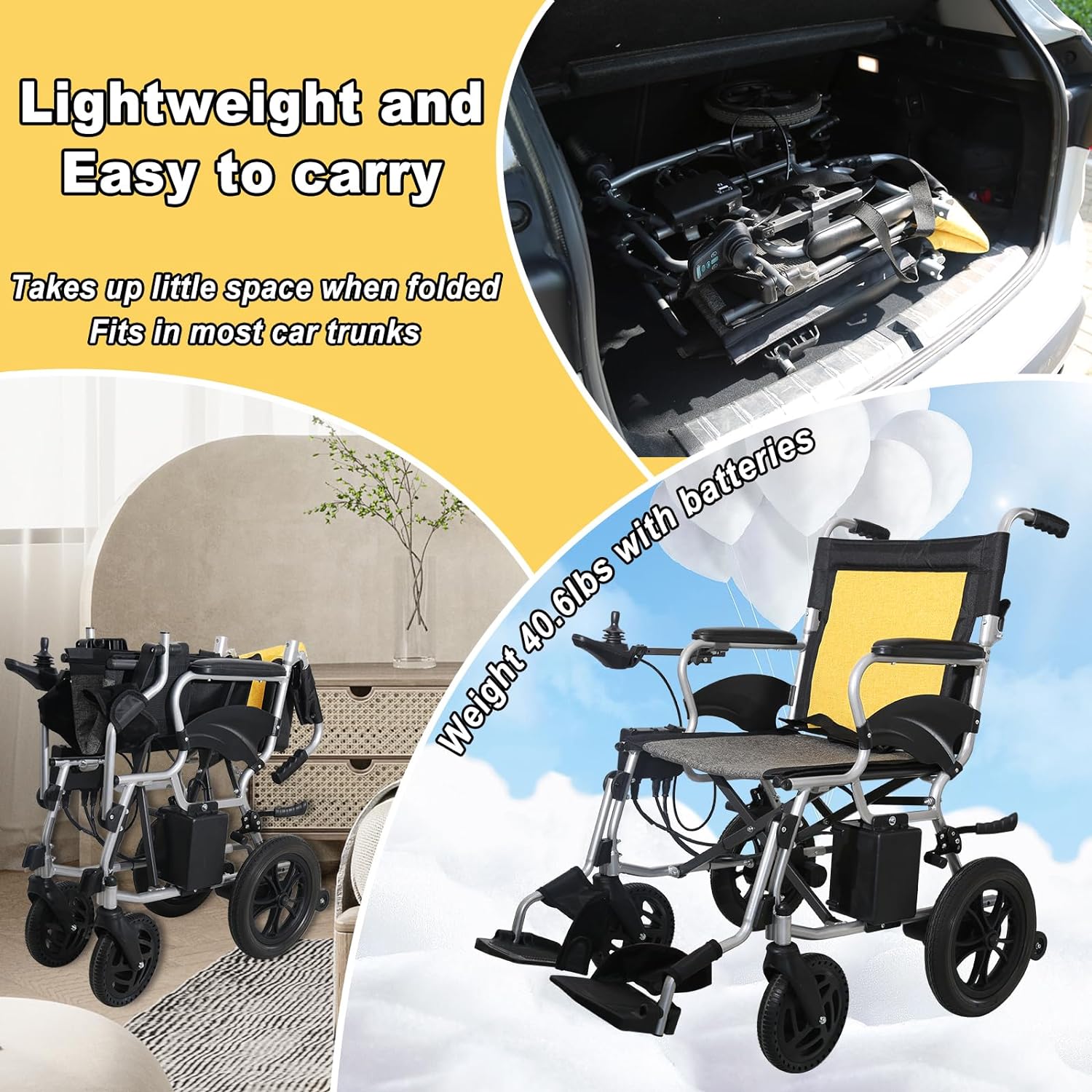 Lightweight Foldable Electric Wheelchair for Adults: Weighing just 40.6 pounds, this portable power wheelchair is designed for those who value both convenience and performance. With dimensions of 41.7" D x 25.2" W x 36.2" H, it offers a modern, sleek style that fits easily into the trunk of most vehicles, making it perfect for travel and daily errands.
