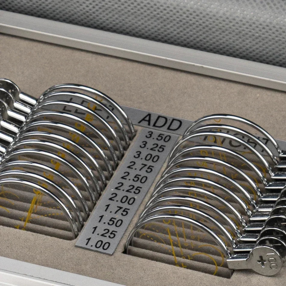 Discover precision with our Progressive Trial Lens Set featuring 22 lenses. Each lens boasts a diameter of 36mm with a sturdy metal rim measuring 38mm in diameter. With a comprehensive range of ADD powers from 1.00 to 3.50, including two pieces for each power, this set ensures accurate and versatile vision testing.