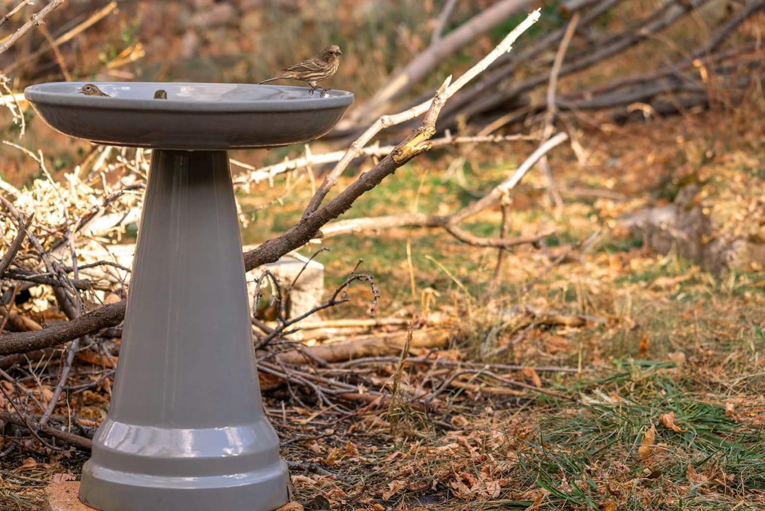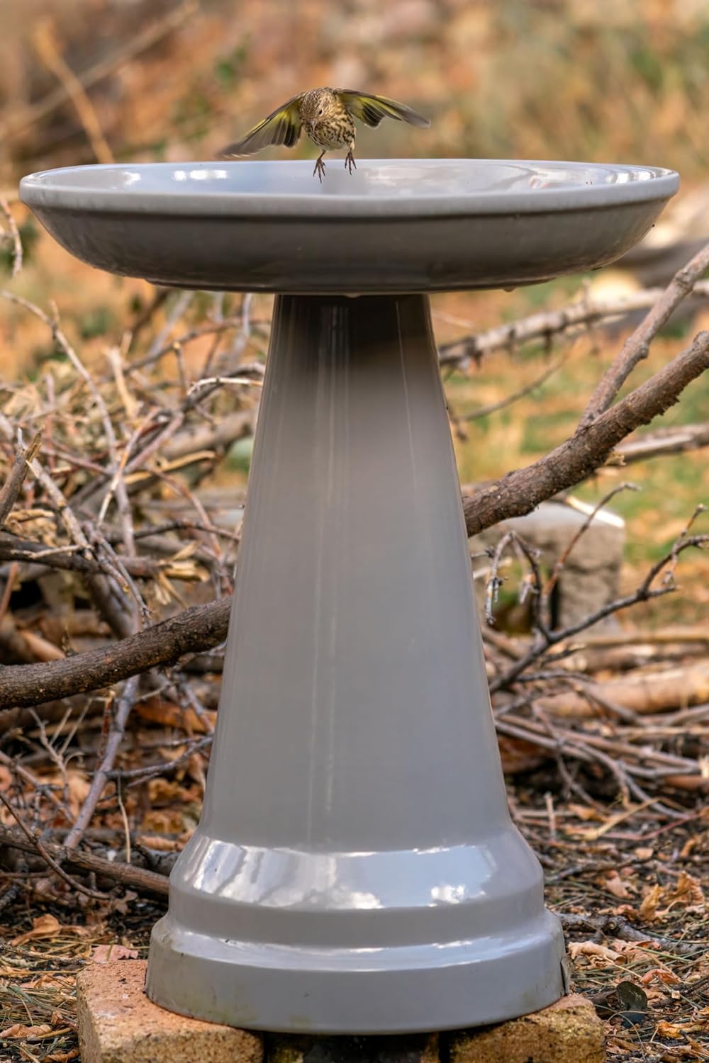 Pedestal Clay Bird Bath: This elegant, minimalist gray bird bath offers a beautiful sanctuary for birds and wildlife. Perfect for patios, yards, decks, or any outdoor space.