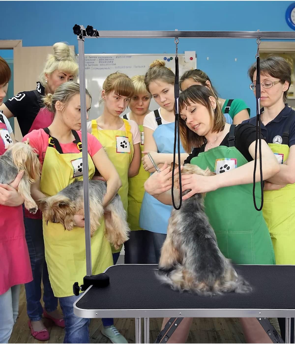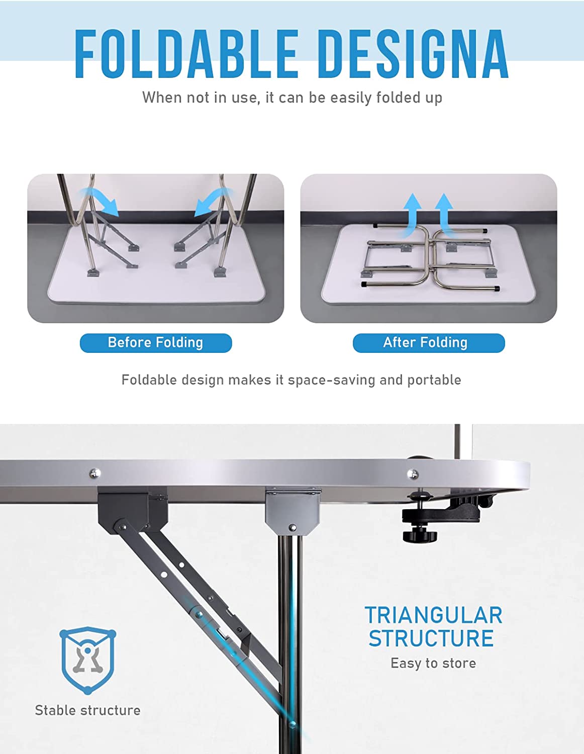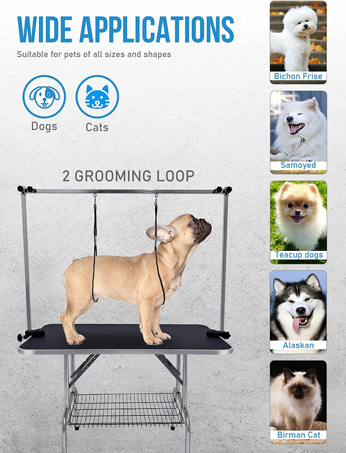 Foldable Dog Grooming Table: This dog grooming table has a sturdy stainless steel frame and non-slip rubber feet to avoid shaking or sliding on the floor. The foldable design is perfect for easy storage and space saving when the table is not in use.