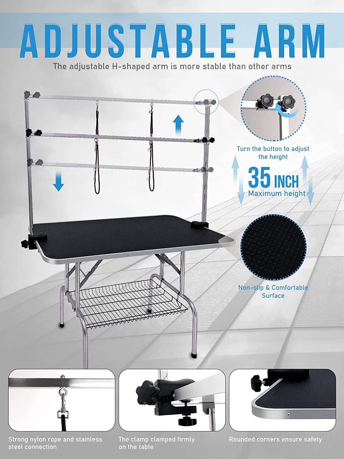 Adjustable Arm: The grooming arm can be adjusted in height by turning a knob to accommodate dogs of different sizes. Its maximum height is 36 inches from the tabletop amd the 30-inch-high table legs allow you to stand upright (and avoid getting back pain) while grooming your pets.