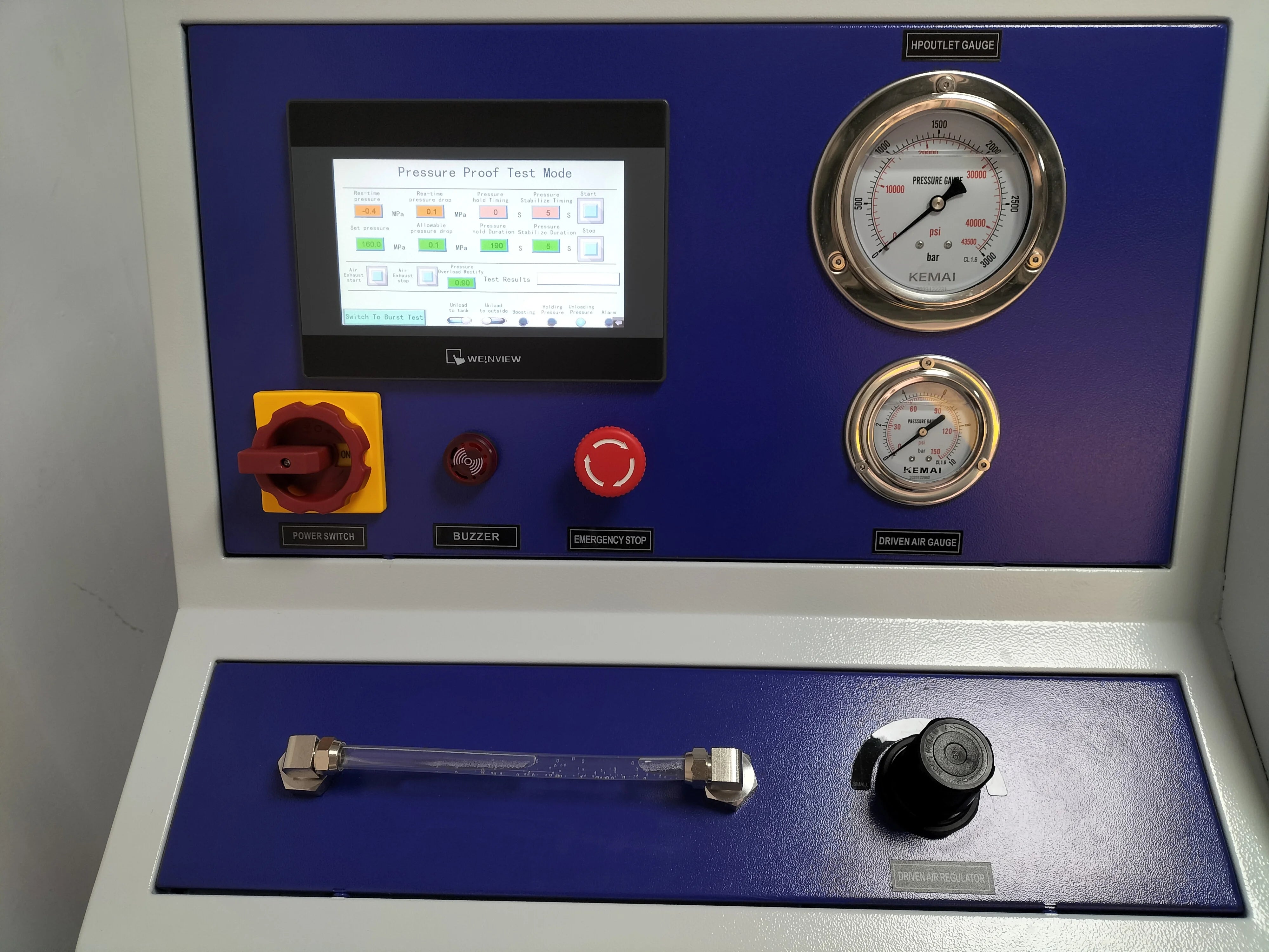 (3). Rotate “Driven air regulator” button to right until maximum (4). Turn on “Power switch” to activate Touch screen, enter “Proof-pressure test interface”, then preset parameters value such as Pressure, Pressure drop, Pressure holding time, etc.