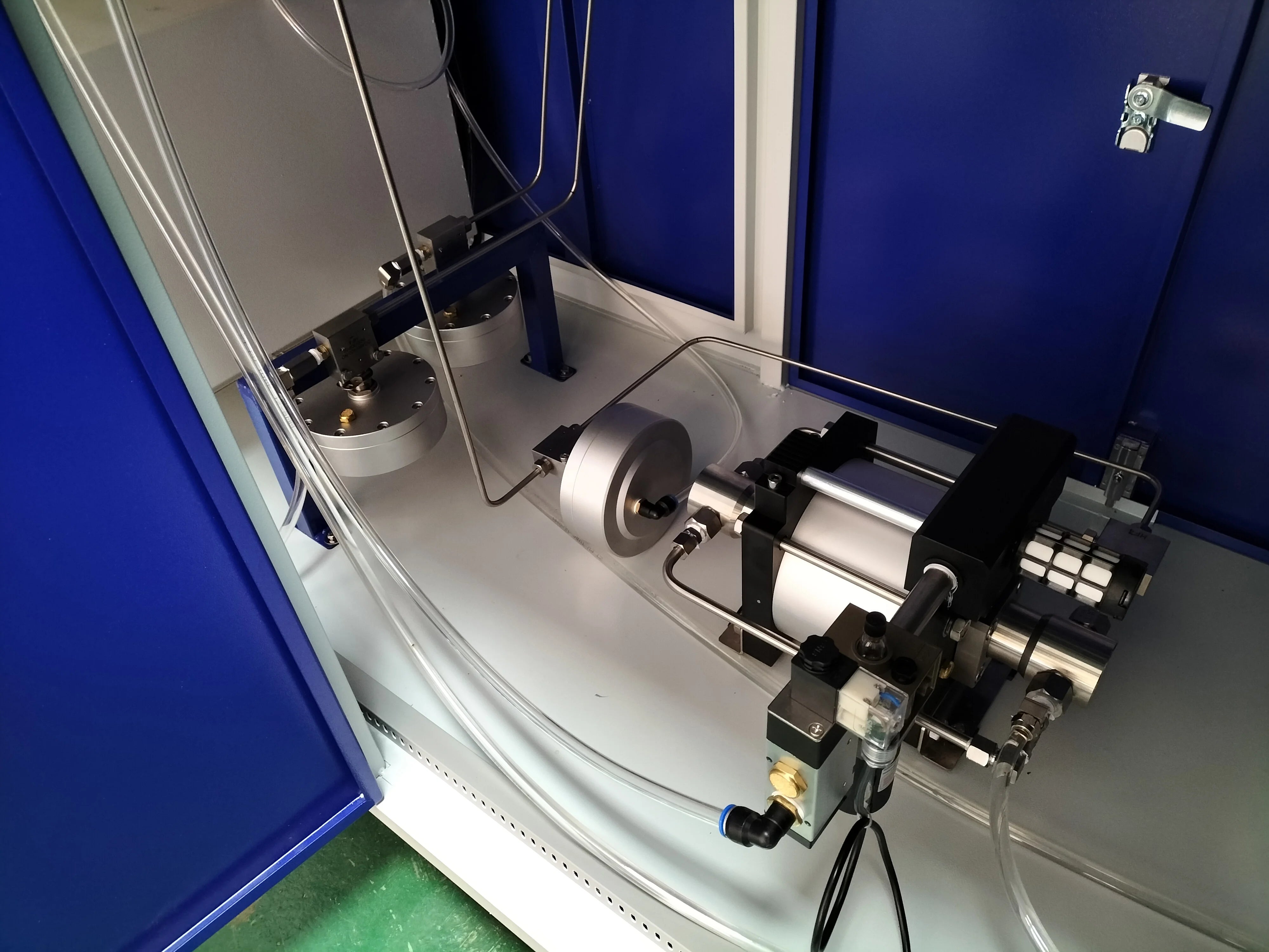 Working Principle: The system uses compressed air (3-8 bar) as a power source, which is converted into high hydraulic pressure via a pneumatic liquid booster pump. This hydraulic pressure serves as the test medium to conduct hydrostatic and burst testing on various items.