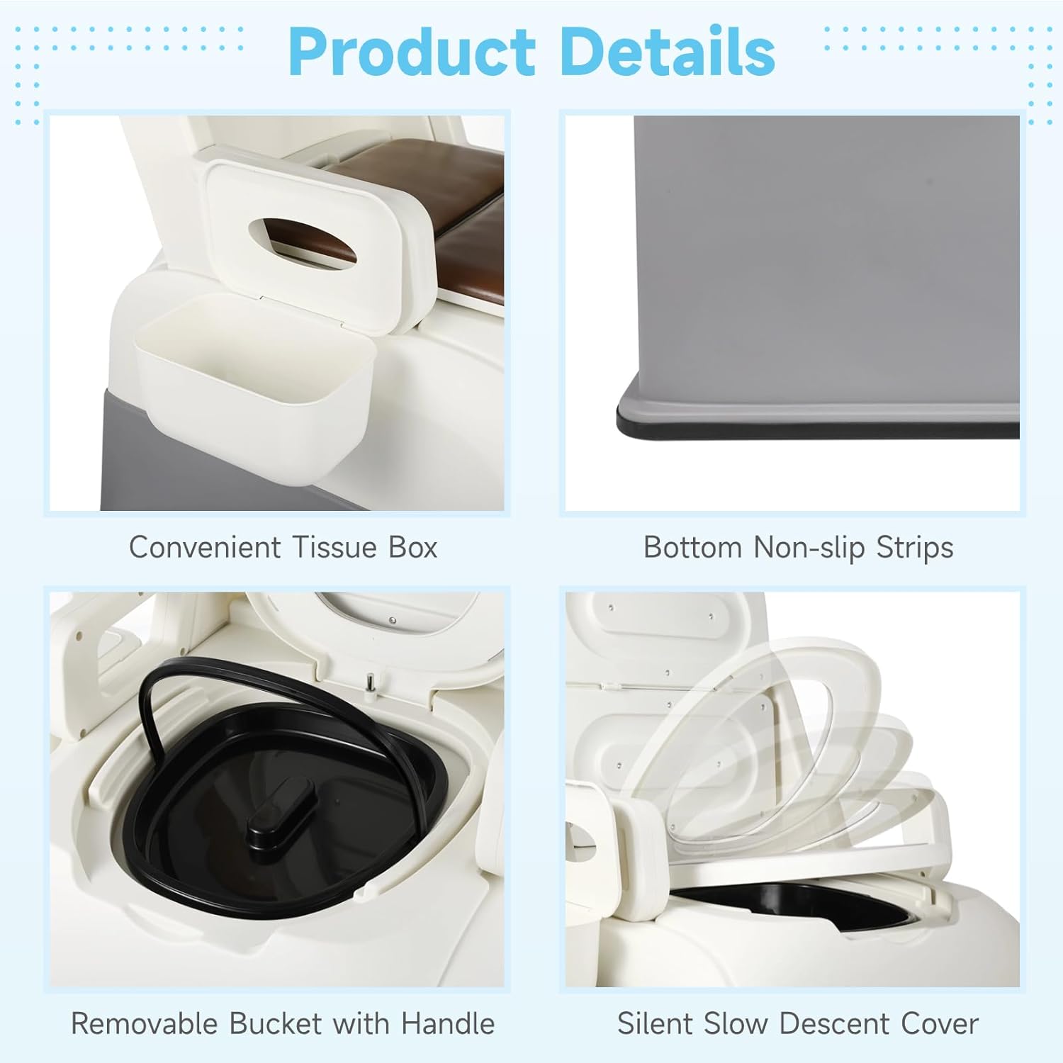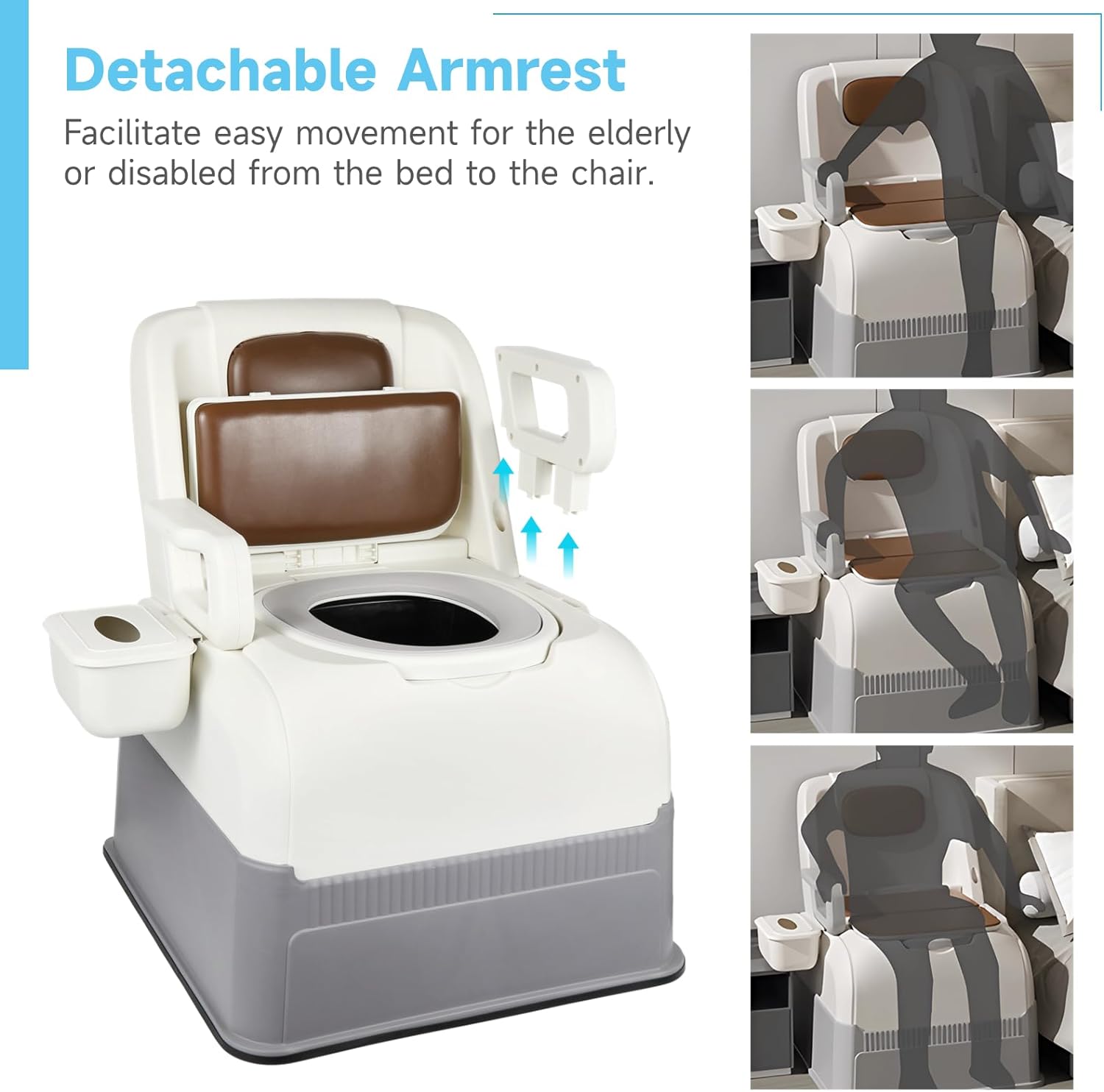Odor-Free and Convenient: Equipped with dual lids for effective odor isolation, this portable toilet is perfect for indoor use. Detachable armrests facilitate easy movement for the elderly, while a handled inner bucket, tissue box (installable on both sides), and 3 rolls of waste bags ensure added convenience.