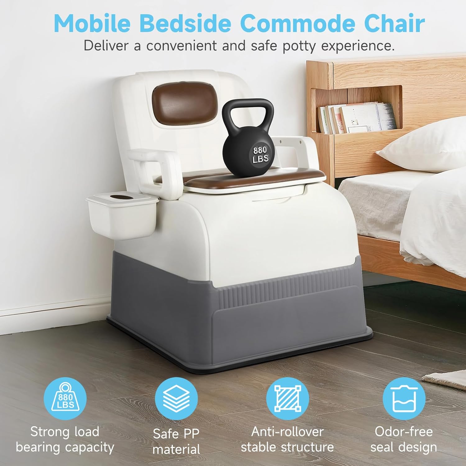 Experience Stability and Comfort: Our Mobile Bedside Commode Chair offers a robust construction crafted from non-toxic and durable PP material, supporting up to 880 lbs without compromising on safety. The enlarged structure and bottom non-slip strip ensure stability, preventing slips and overturning during use.
