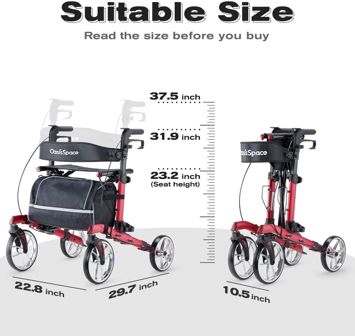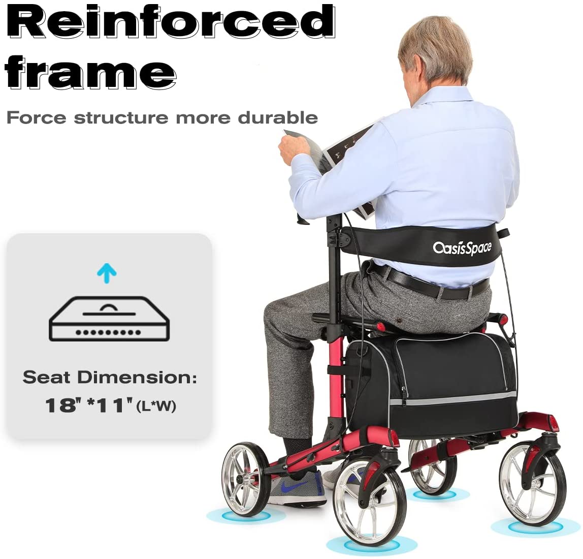 • Rollator Seat dimensions: 18"(L) x 11"(W) x 21"(H) (Non-adjustable)