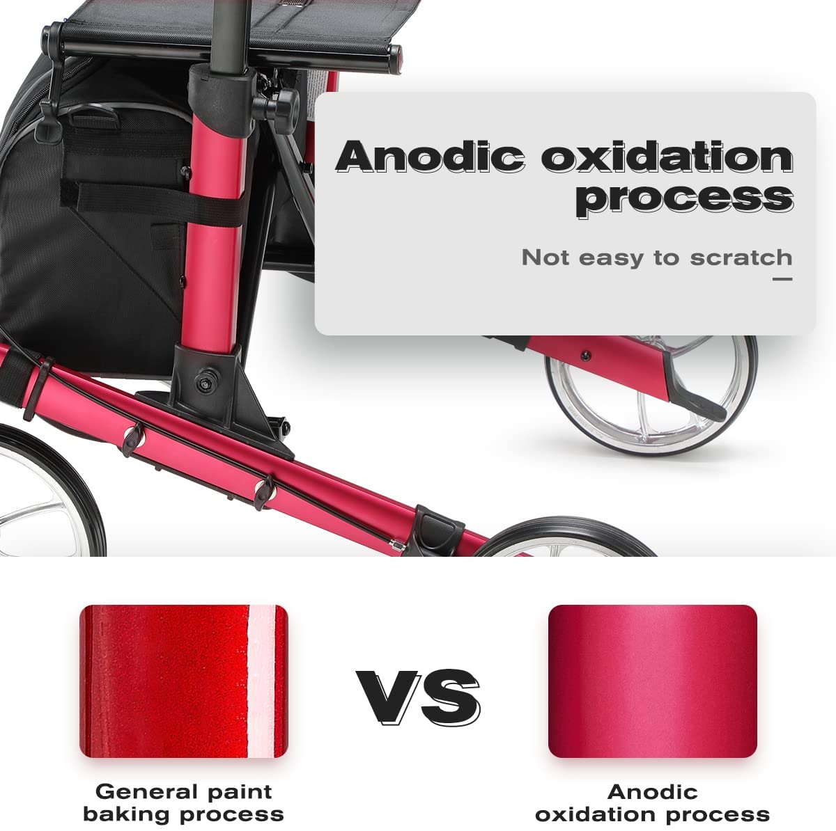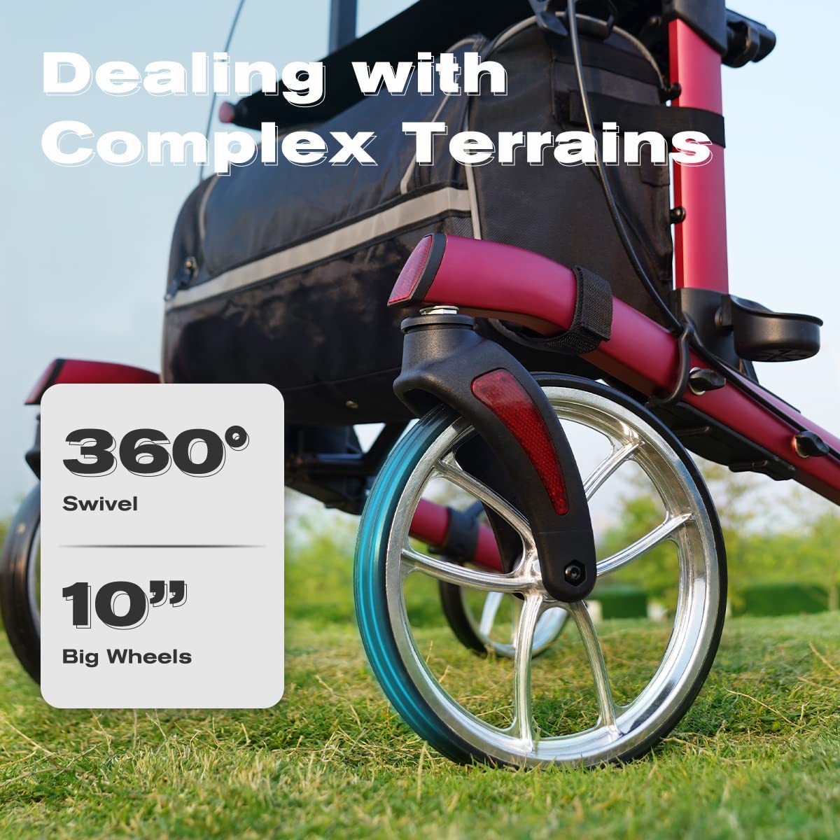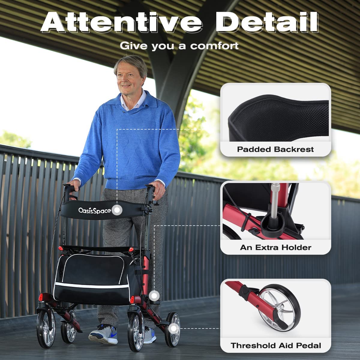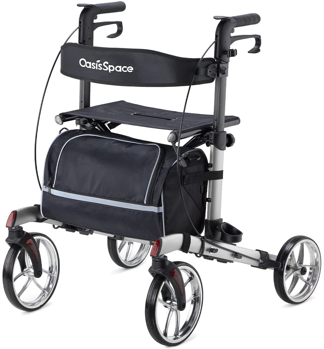 • Stable walker structures by premium aluminum, Large wheels, Wider seat and padded backrest, which can support 300lbs(weighs only 23lbs). Besides, the large capacity storage bag and cane& cup holder will leave your hands free when you have a leisure time outside.