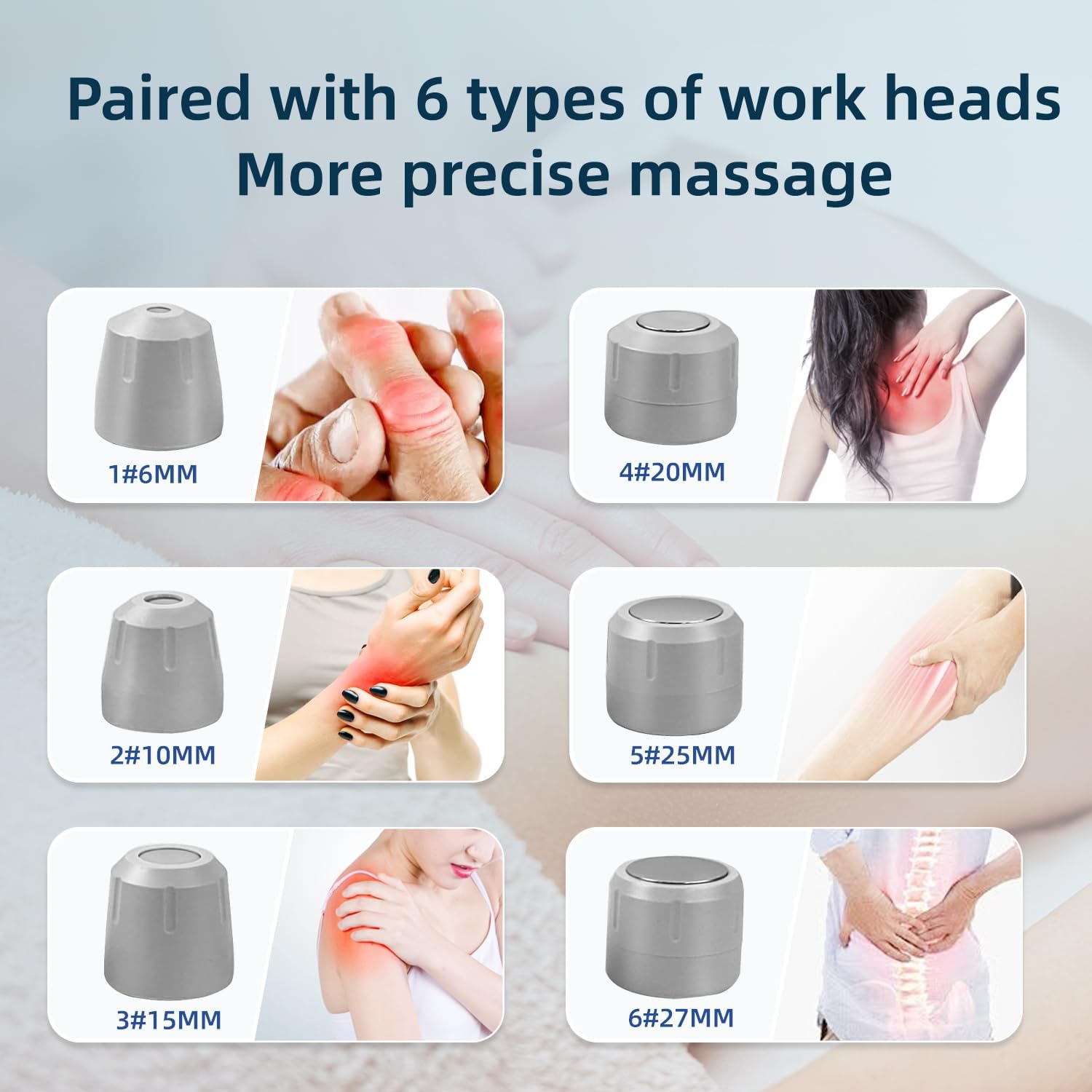 6 ergonomic massage heads designed for different muscle sizes