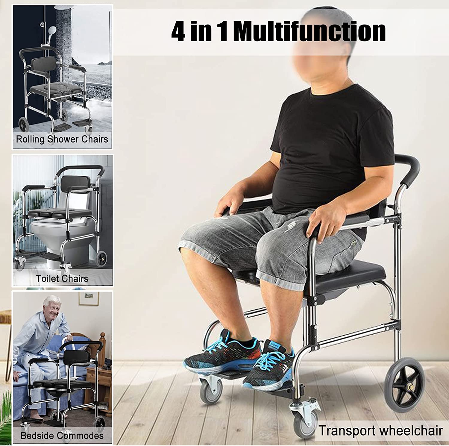 The ergonomic design of the rolling shower chair allows it to be used as a shower chair, transport wheelchair, bedside commode chair, or you can remove the bucket and place the chair directly on the toilet as a toilet safety frame. Perfect for seniors or anyone who needs help in the shower, make showering and care easier.