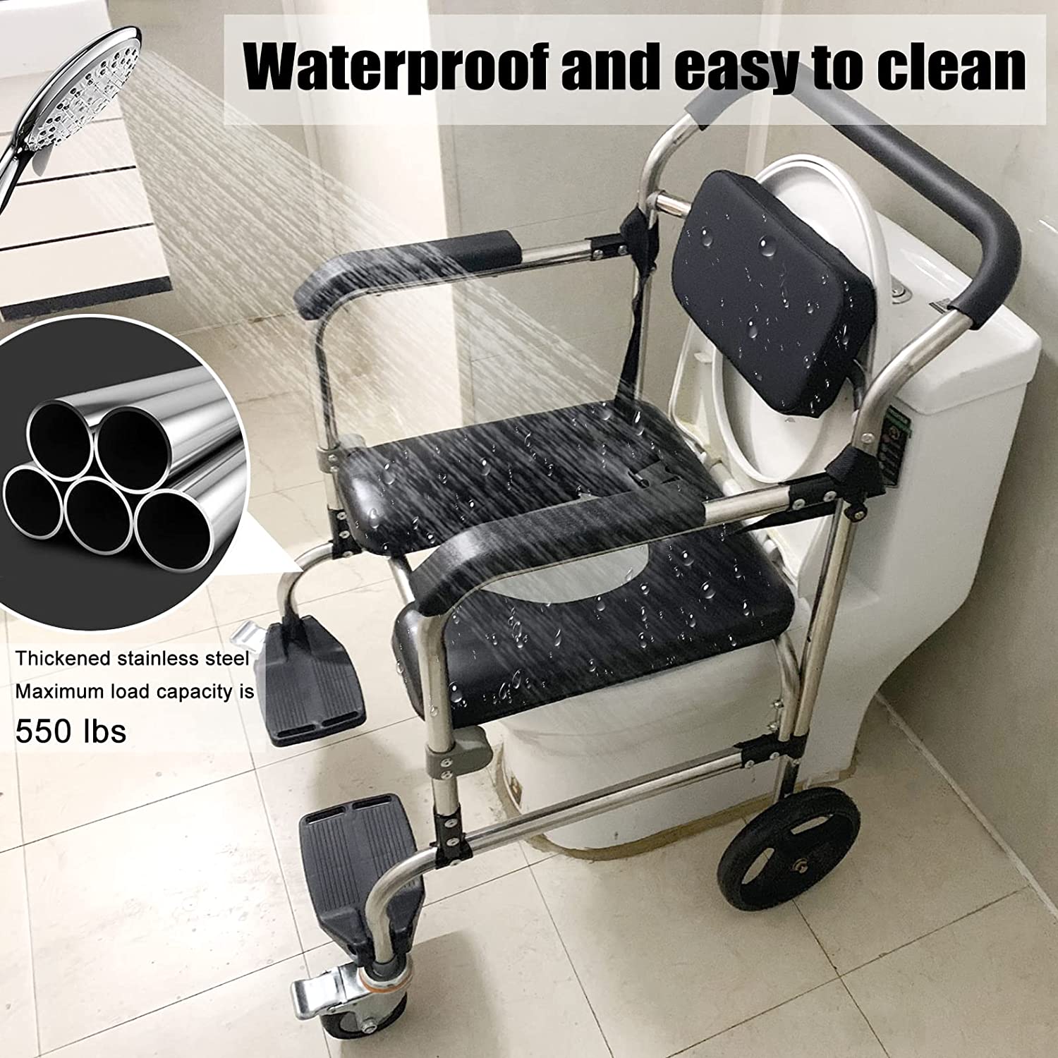All parts of the shower wheelchair with wheels are made of waterproof material, which can be used in bathrooms or other wet environments, making it convenient for the elderly and injured people to perform daily care at home or in the hospital.