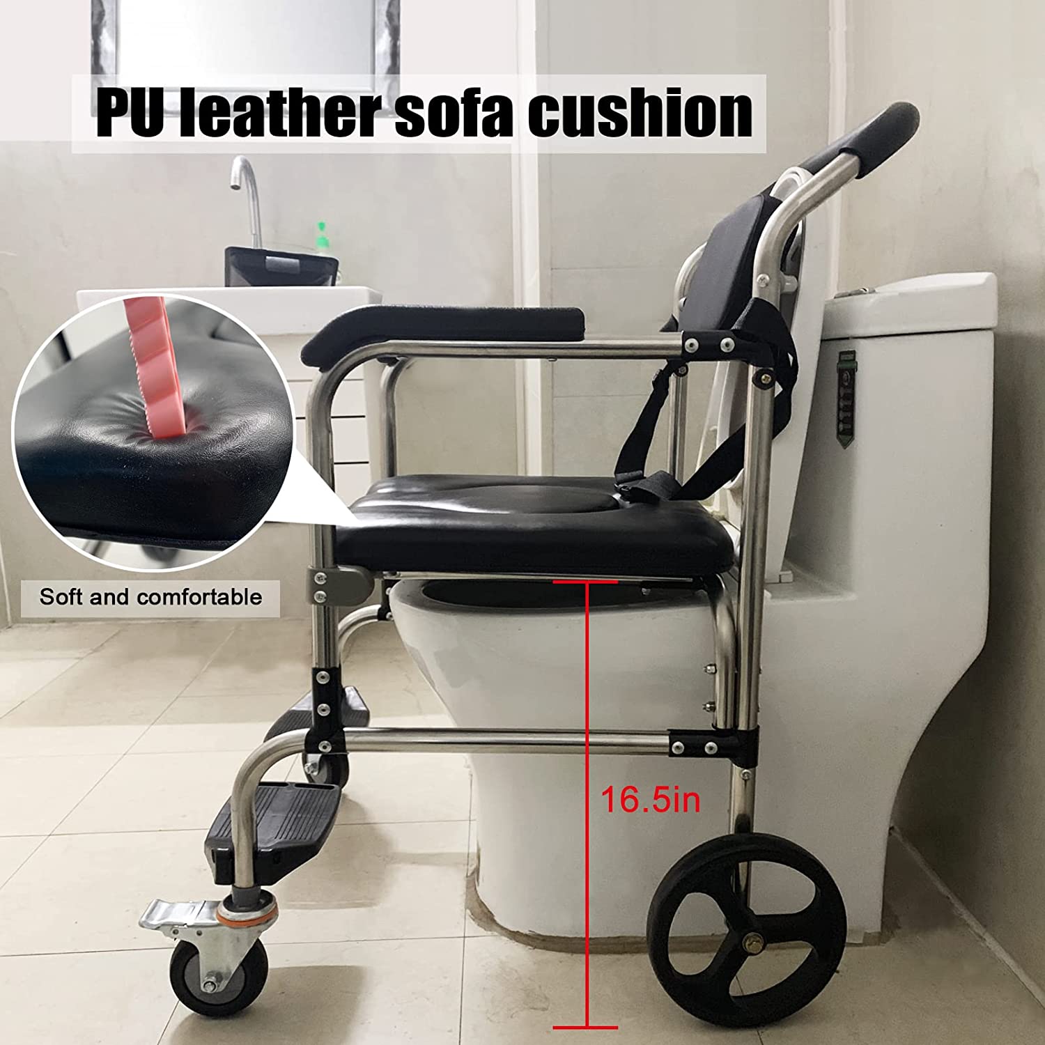 PU leather sofa cushion, long sitting without tiredness, easy to clean and more comfortable. The commode chair with armrest frame is made of thickened stainless steel, enough to support up to 550lbs. Sturdy and durable for most people.