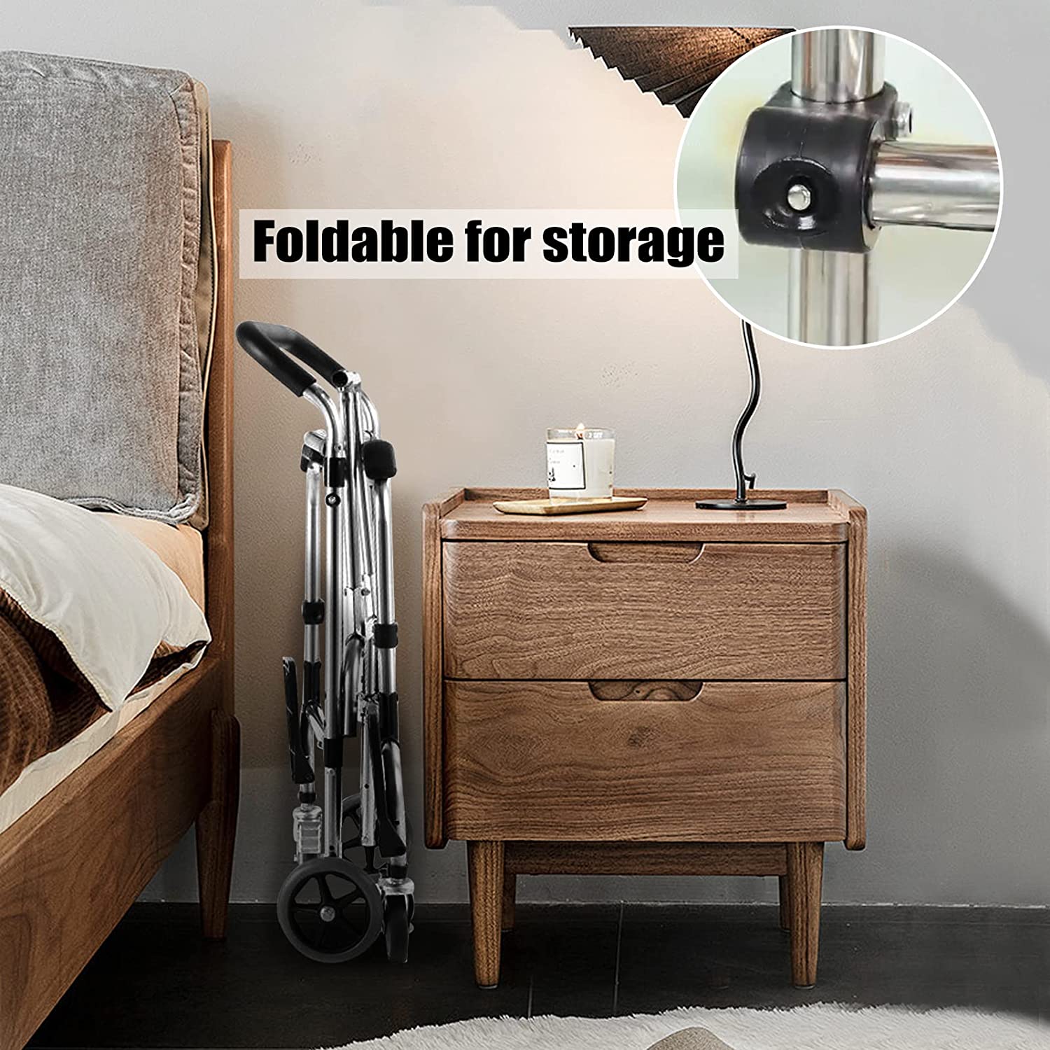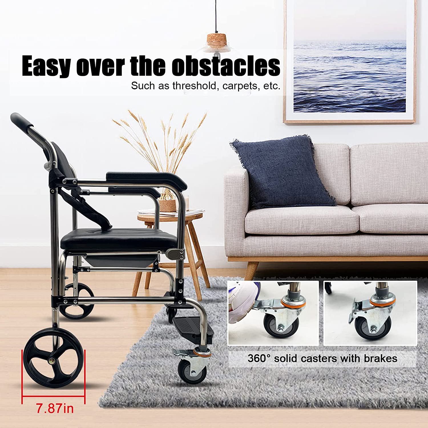 The bedside commode is equipped with 2 front wheels can rotate 360 with brakes, safe and controllable. 7.87inch larger rear caster provide great convenience for threshold and carpet movement. Suitable for indoor and outdoor using.