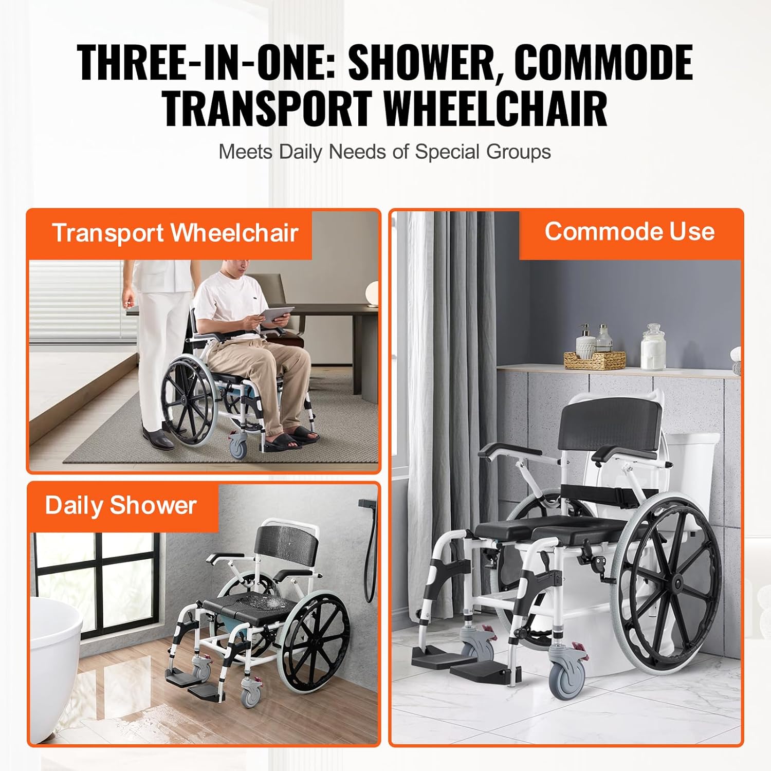 Extra Caster Wheels Included: This shower wheelchair includes an additional set of 2x 5'' caster wheels, allowing for easy conversion into a commode chair. Its spacious design accommodates a variety of users and body types, with a commode featuring a removable seat cushion for added convenience.