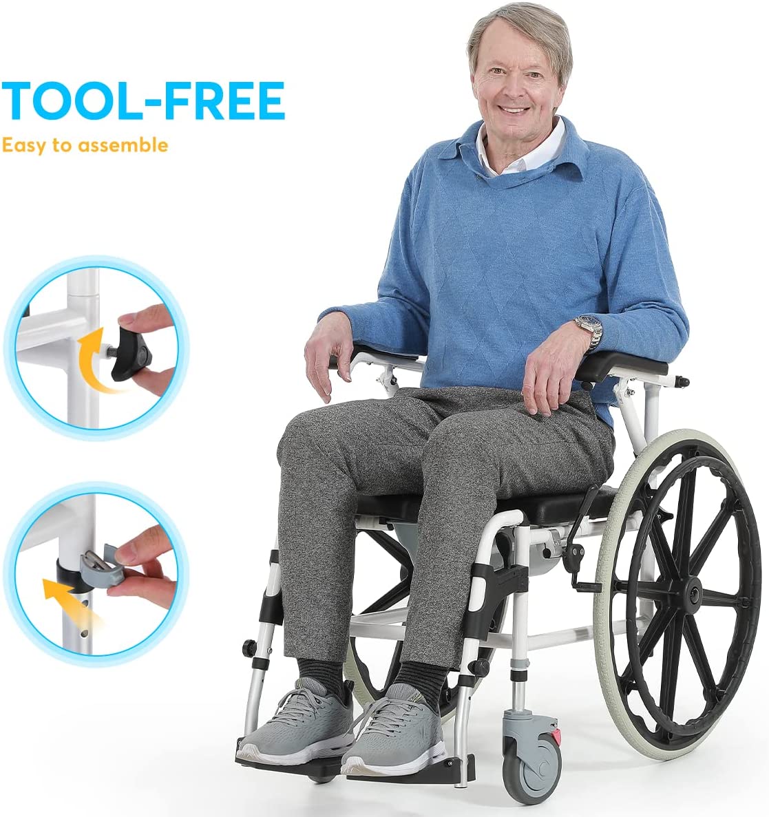 - Compact Size & Easy Assembly: The widest part of chair is 22ββ, so that it is able to fit through the narrow doorway or shower stall. The flip-away footrests allow users to rest their feet in a comfortable way. Tool free, easy to assemble in 15 minutes.