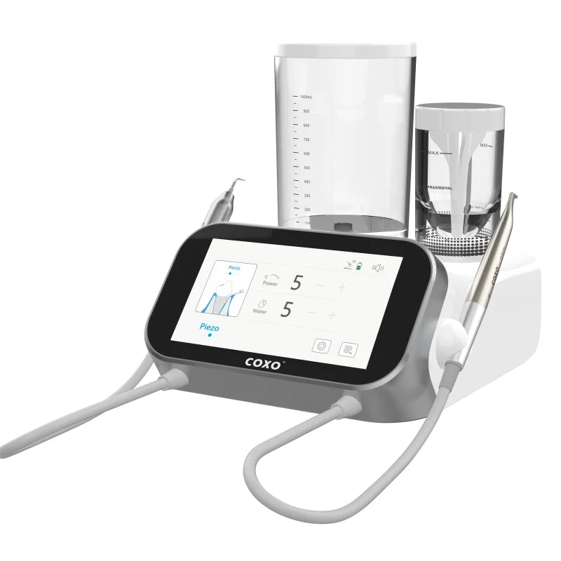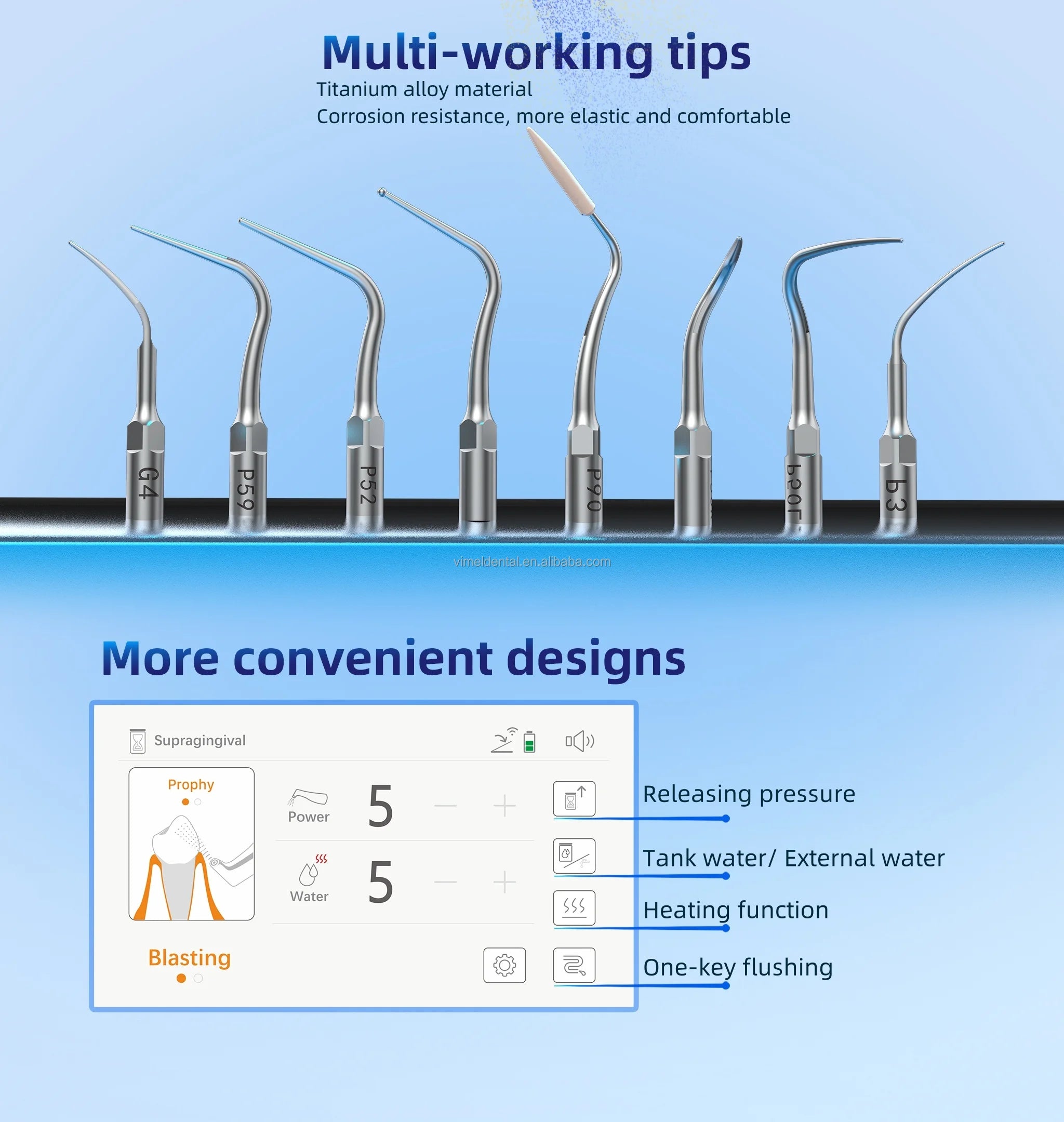 Upgrade your dental practice with the PT MASTER Dental Scaler and Air Polisher, designed for precision and versatility. Equipped with an LED light and wireless pedal control, this two-in-one device combines scaling and sandblasting capabilities in one compact unit. It supports multiple dental functions, including scaling, perio, endo, and irrigation, making it suitable for comprehensive oral care. The air polisher is ideal for both supragingival and subgingival cleaning, ensuring thorough plaque and stain removal. With an ultrasonic tip vibration offset of less than 200um and a frequency range of 24-36kHz, it provides gentle yet effective cleaning.